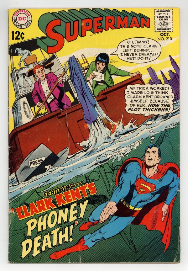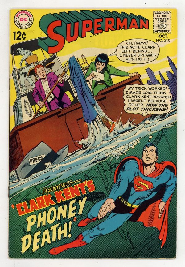 Cover art by Neal Adams. Clark Kent's Last Rites starring Superman, Rabbit-foot" Willie (villain), Lana Lang, Lois Lane, Lucy Lane, Jimmy Olsen, Perry White, and Aquaman (cameo), script by Leo Dorfman, pencils by Curt Swan, inks by Mike Esposito; Superman escapes underwater after shedding Kent clothes to trick Jimmy and Lois into thinking he's drowned. 36 Pages, Full Color. Cover price $0.12.