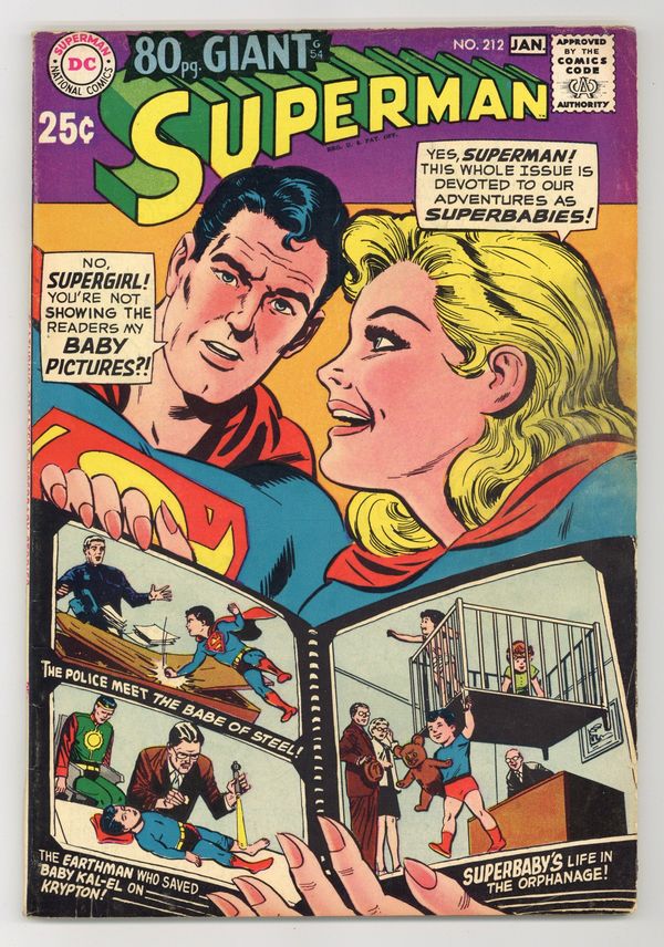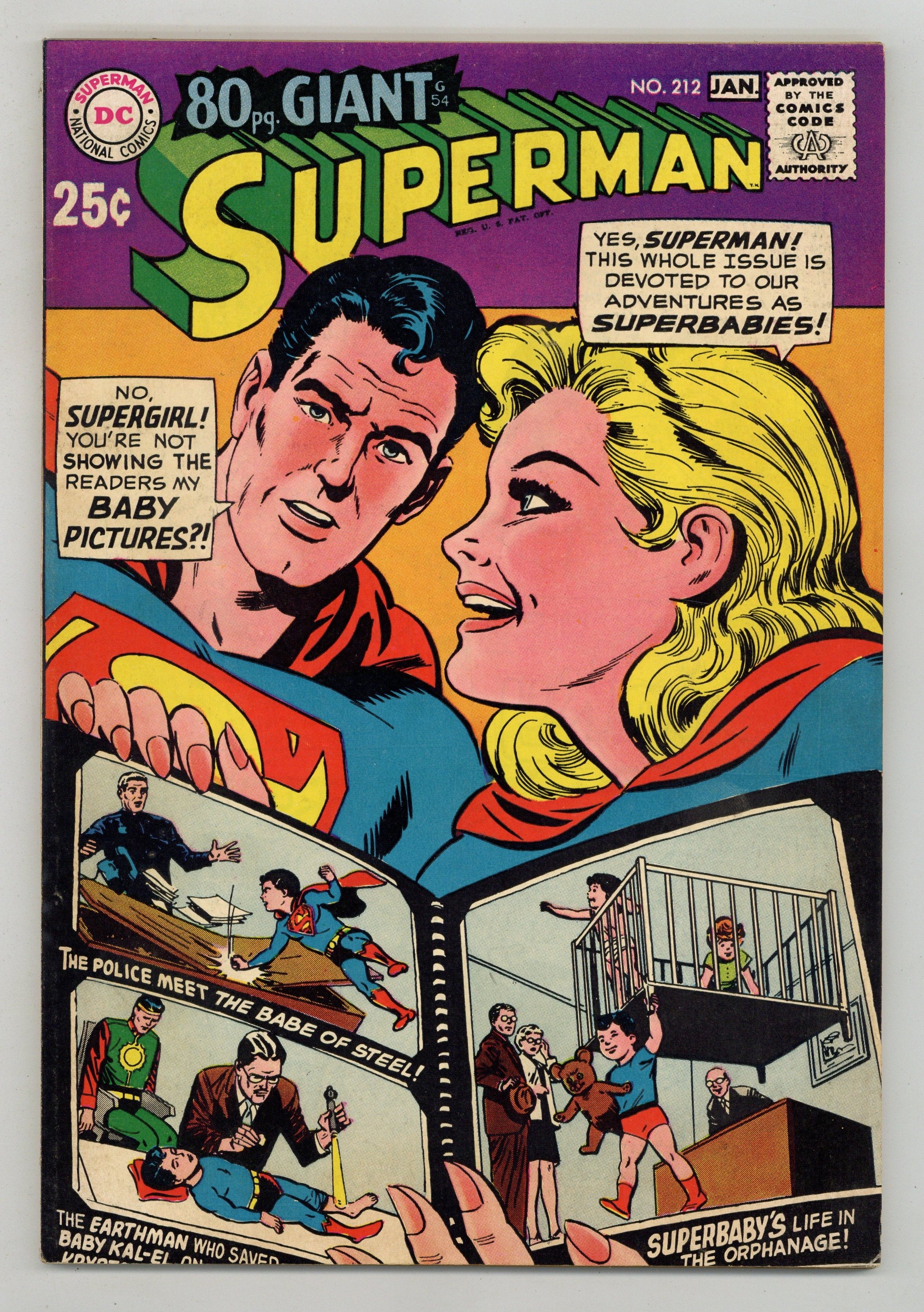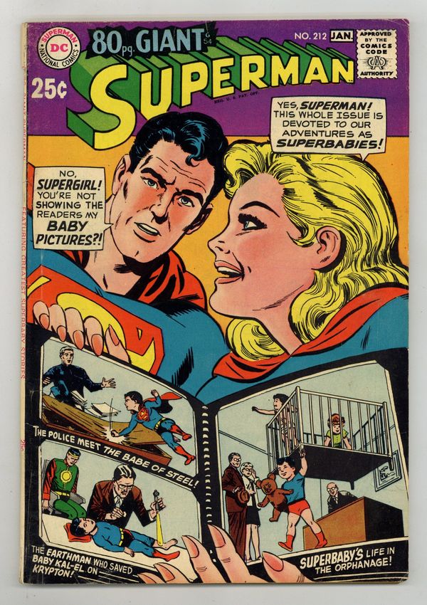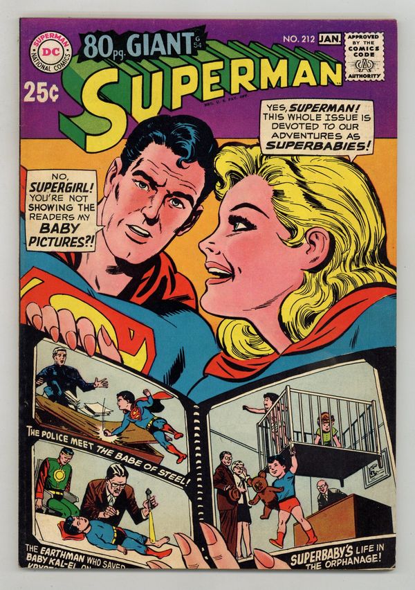 Cover pencils by Curt Swan, inks by Mike Esposito. DC Giant featuring the following stories: The Man Who Saved Kal-El's Life!, script by Robert Bernstein, art by Al Plastino; Superman meets Professor Dunn who visited Krypton and meet Jor-El before Krypton exploded; Using the Professor's "Matter-Radio" plans, two crooks are on a crime spree. The Rejected Super-Tot!, script by Jerry Siegel, art by George Papp. The Babe of Steel!, script by Robert Bernstein, pencils by Curt Swan, inks by George Klein; Superman uses red kryptonite to become baby-sized in order to get through a hole in the Phantom Zone that threatens to become larger. The Girl Superbaby!, script by Otto Binder, art by Jim Mooney. The Grandson of Steel!, script by Otto Binder, art by John Sikela. Lois Lane's Revenge on Superman!, script by Jerry Siegel, pencils by Curt Swan, inks by George Klein. The Unwanted Superbaby!, script by Jerry Siegel, art by George Papp; First Gold K appearance. 84 Pages, Full Color. Cover price $0.25.