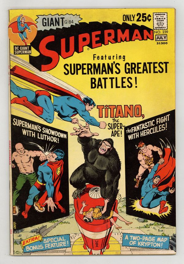 Cover pencils by Curt Swan, inks by Murphy Anderson. DC Giant. Hercules in the 20th Century!, script by Otto Binder, pencils by Wayne Boring, inks by Stan Kaye; Lex Luthor builds a time-machine to bring Hercules to the present to use him to stop Superman. Superman's Battle with Hercules!, script by Otto Binder, pencils by Wayne Boring, inks by Stan Kaye; Hercules wants to marry Lois, but Lois won't marry him while Superman is around. Titano the Super-Ape!, script by Otto Binder, pencils by Wayne Boring, inks by Stan Kaye. The Showdown Between Luthor and Superman!, script by Edmond Hamilton, pencils by Curt Swan, inks by George Klein. Map of Krypton, script by E. Nelson Bridwell, art by Sal Amendola. 68 Pages, Full Color. Cover price $0.25.