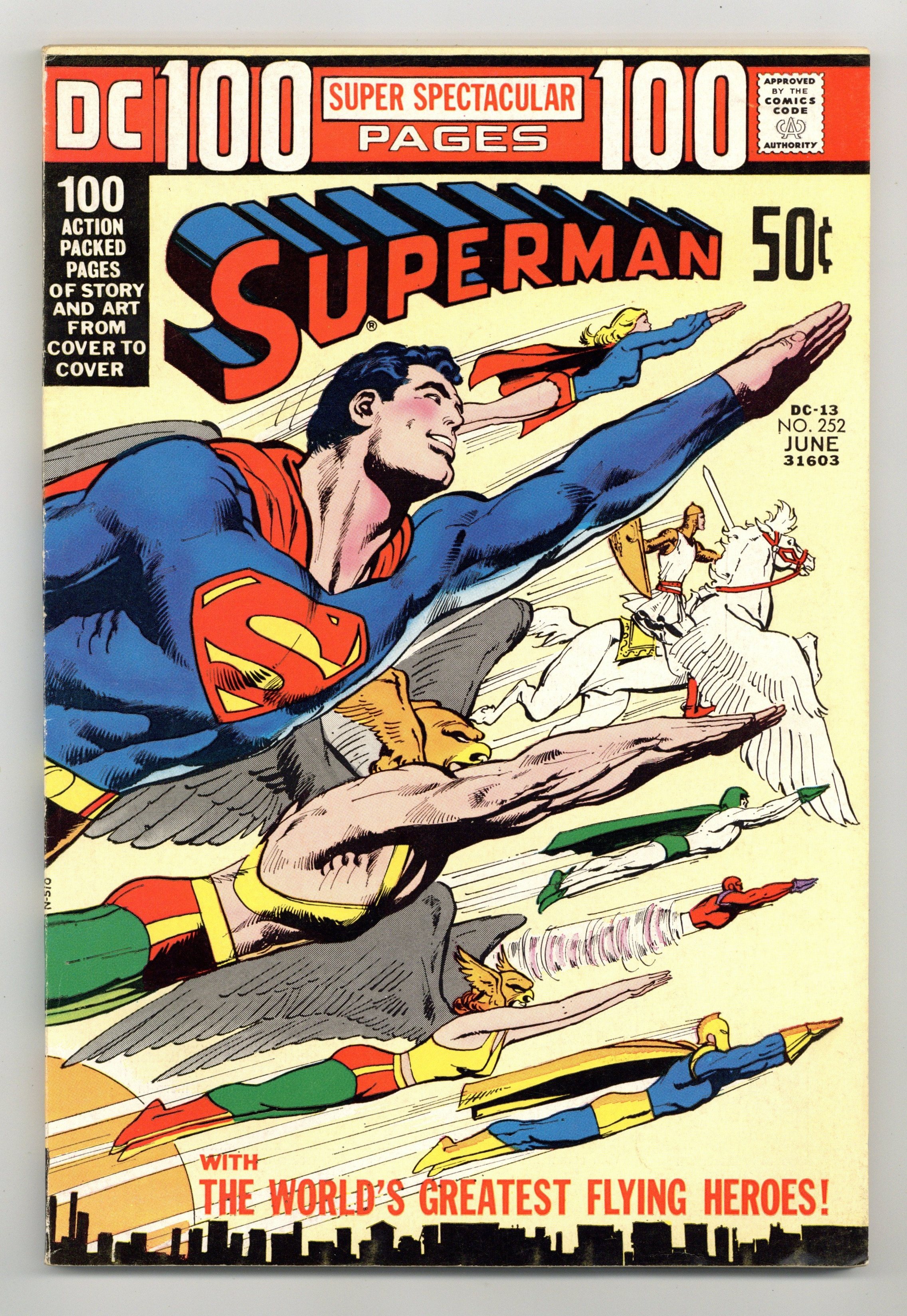 $38.00A great Neal Adams wrap-around classic cover featuring 21 super heroes in dynamic flight gets this beautiful 100-page giant off to a soaring start (see inside back cover for cover key/diagram and cool info about each hero). The lead off story, "Powerstone!" is a Superman reprint from Action #47 (April, 1942) with none other than Luthor as Superman's challenger. Luthor pops up again and faces death in the electric char in "When Titans Clash!" from Superman #17 (July-Aug. 1942). Next up is a great Doctor Fate reprint from More Fun Comics #57 (July, 1940), with Howard Sherman art. Other Golden Age reprints include Hawkman from Flash Comics #24 (Dec. 1942) with art by Sheldon Moldoff; a great Black Condor story from Crack Comics #18 (Nov., 1941) with Lou Fine's top-notch art; a Spectre reprint illustrated by Bernard Baily; a Starman story, "The Menace of the Invisible Raiders!" from Adventure #67 (Oct., 1941) by Jack Burnley; another great Lou Fine illustrated story, this time the Ray from Smash Comics #17 (Dec., 1940); then Superman wraps up the issue in "Superman's Greatest Feats!" from Superman #146 (July, 1961) with art by Al Plastino. 100 Pages, Full Color. Cover price $0.50.