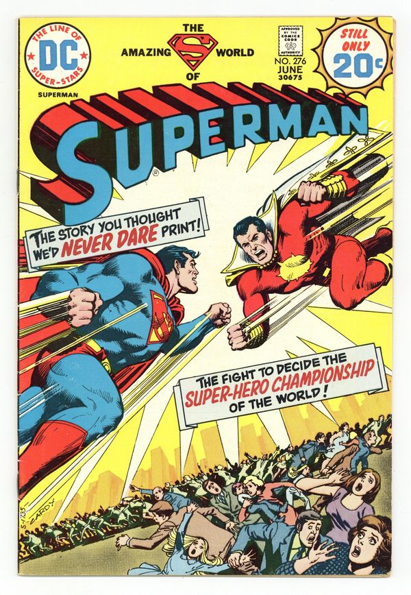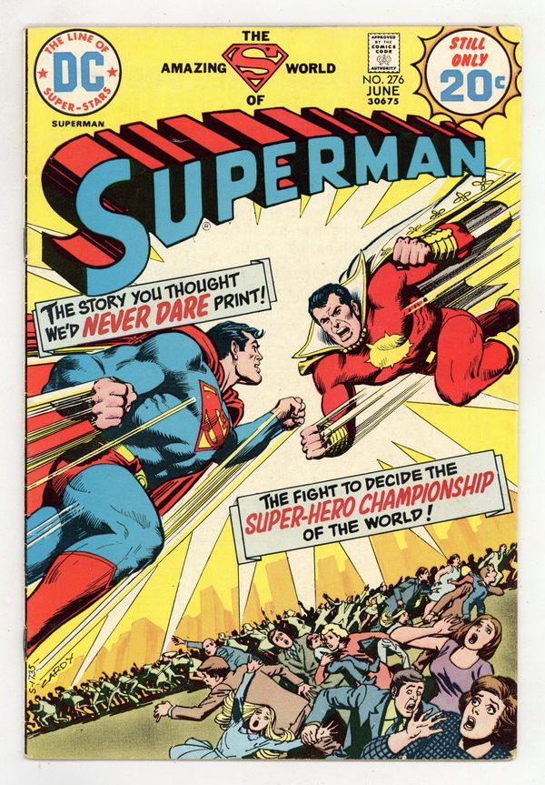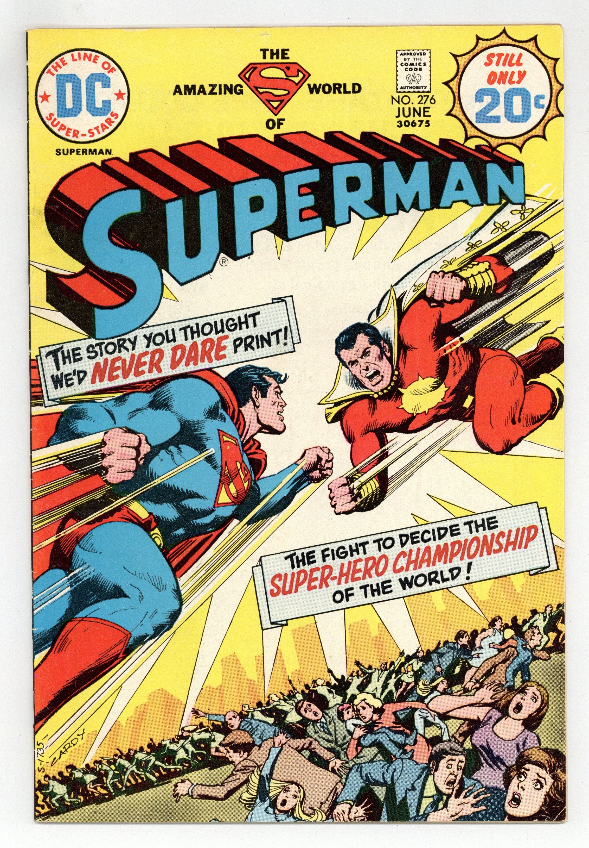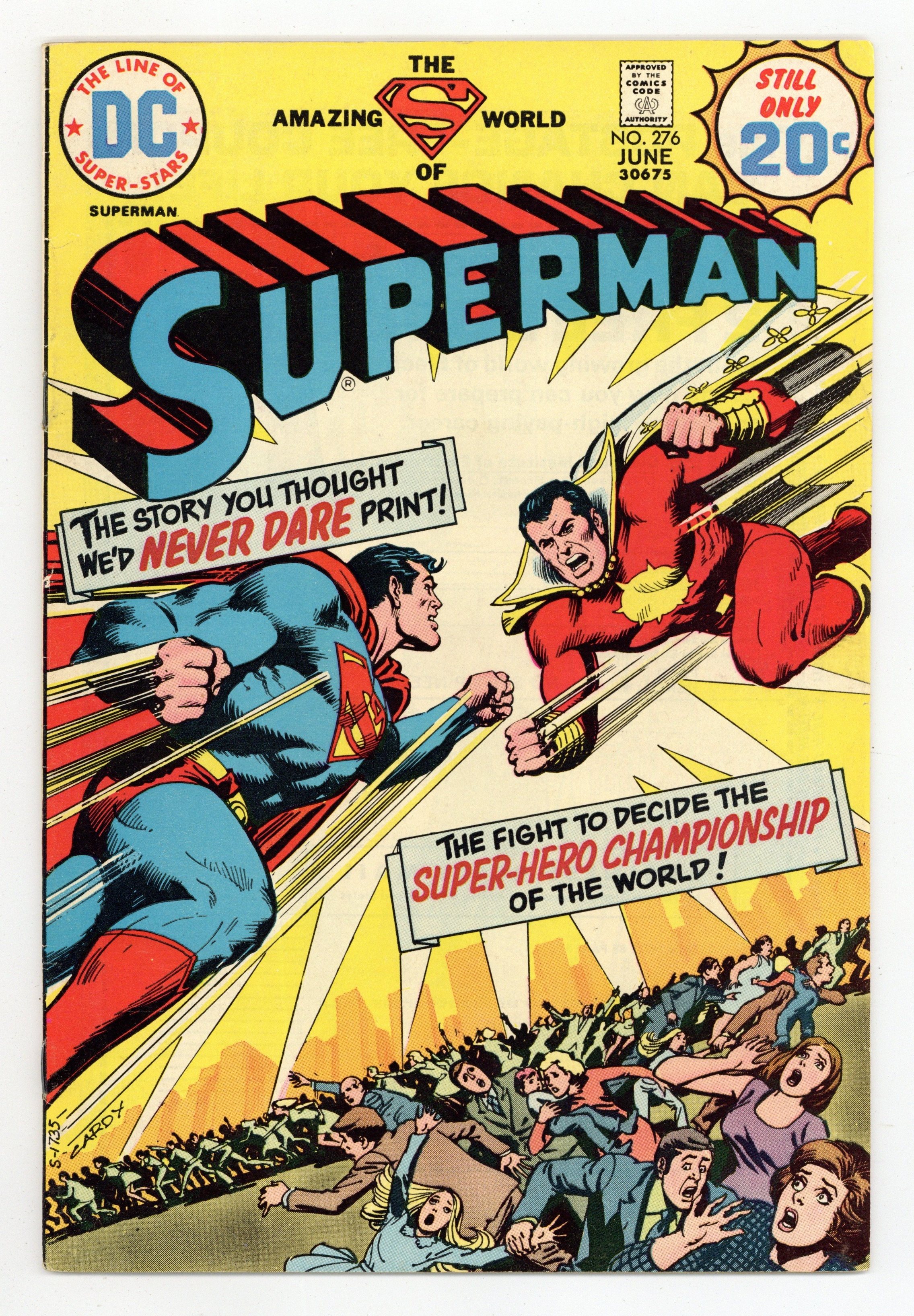 Cover art by Nick Cardy. Make Way for Captain Thunder!, script by Elliot S! Maggin, pencils by Curt Swan, inks by Bob Oksner; Willie Fawcett finds himself lost in Superman's universe and that whenever he changes into his super-powered alter ego of Captain Thunder he becomes evil; Superman helps him figure out the way to return to his universe and shake the evil influence of the Monster League of Evil. 36 Pages, Full Color. Cover price $0.20.