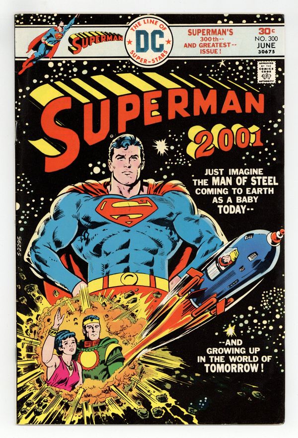 Superman origin retold. Cover pencils by Curt Swan, inks by Bob Oksner. Superman, 2001!, script by Cary Bates and Elliot S! Maggin, pencils by Curt Swan, inks by Bob Oksner; What if Baby Kal-El landed on Earth in 1976? Found by the American military just ahead of the Soviets, Kal-El is raised as a ward of the Army; Tensions over the alien superhuman, now called Skyboy, boil over in 1990 with both the U.S. and the U.S.S.R. launching missiles. Skyboy destroys all of the weapons and abandons his Skyboy identity to live as Clark Kent; In 2001, the Soviets send Moka to Times Square to declare himself the person who saved the planet in 1990 and the rightful ruler of mankind, but Clark comes out of retirement, this time as Superman, and exposes Moka for the fraud he is. 36 Pages, Full Color. Cover price $0.30.