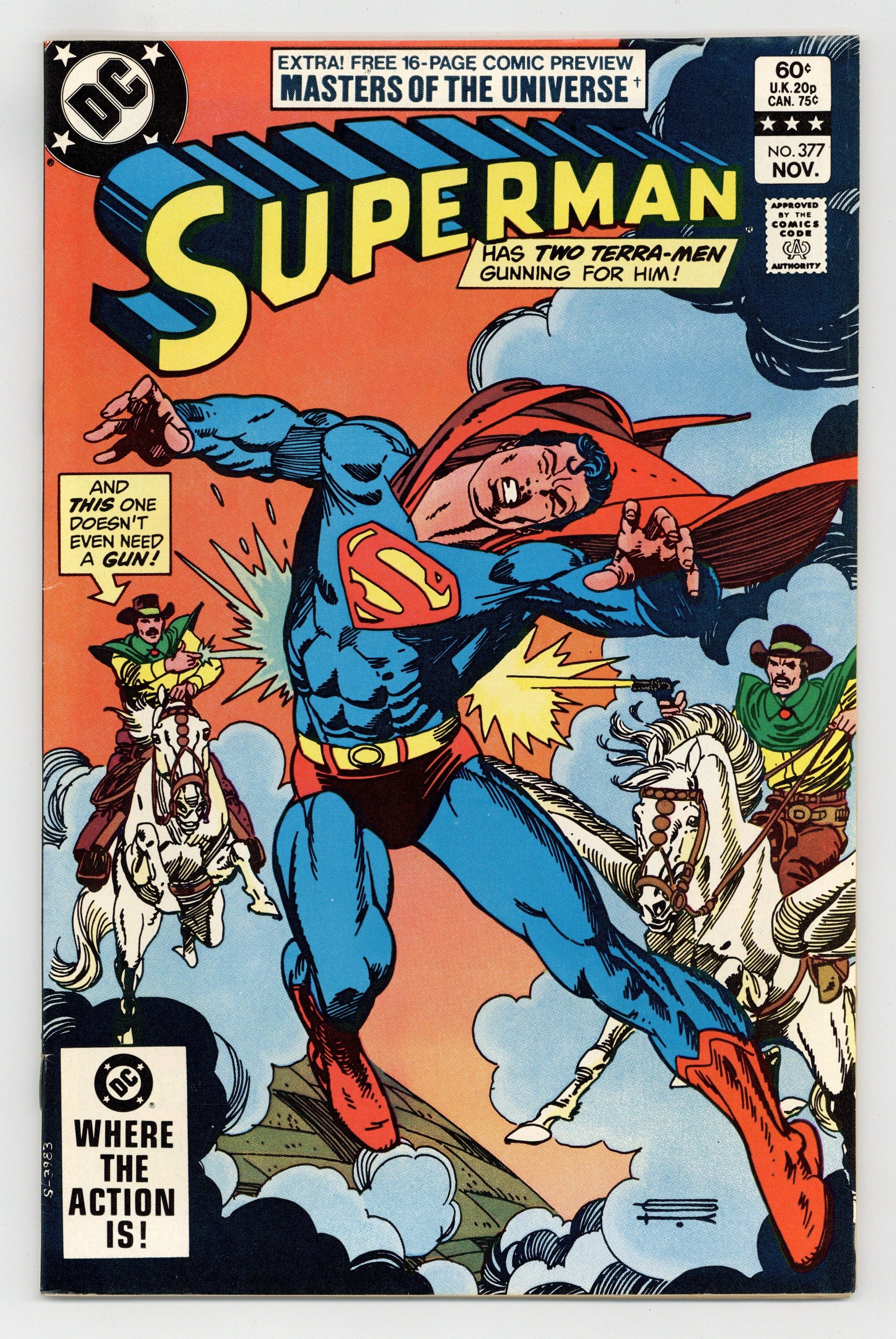 Tags: Superman$14.25Cover art by Gil Kane. Terra Times Two!, script by Paul Kupperberg, pencils by Curt Swan, inks by Dave Hunt; Terra-Man lands on an alternate Earth where Magic exists instead of Science, meets his twin and the two Terra-Men decide to take on Superman. Fate Is The Killer featuring Masters Of The Universe, script by Paul Kupperberg, pencils by Curt Swan, inks by Dave Hunt; stars He-Man, Skeletor, and Superman. 52 Pages, Full Color. Cover price $0.60.