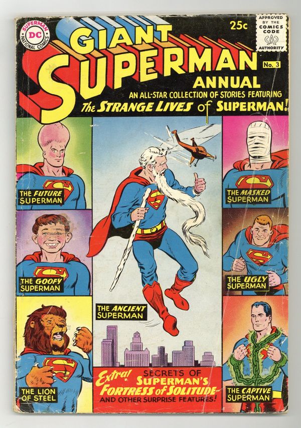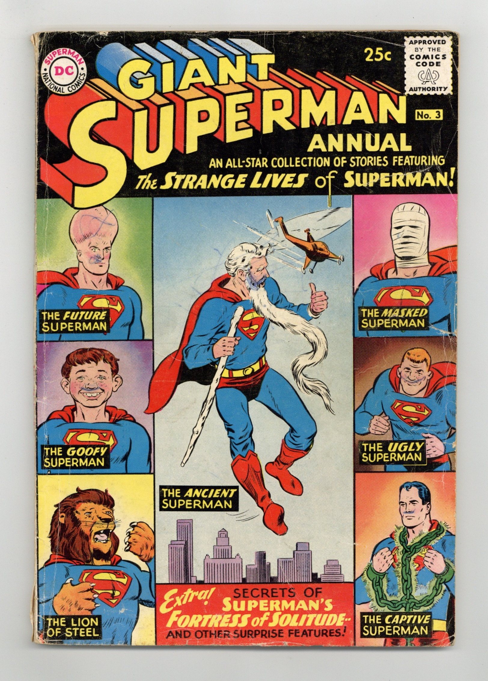 80-page giant. Reprints: The Strange Lives of Superman. Stories include "The Super-Prisoner of Amazon Island," "Superman's New Face," "Thje Ugly Superman," "The Lady and the Lion," "The Superman of the Future" (pencils by Curt Swan), "The Oldest Man in Metropolis," and "The Two Faces of Superman." Two-page feature, "The Secrets of the Fortress of Solitude." Cover price $0.25.