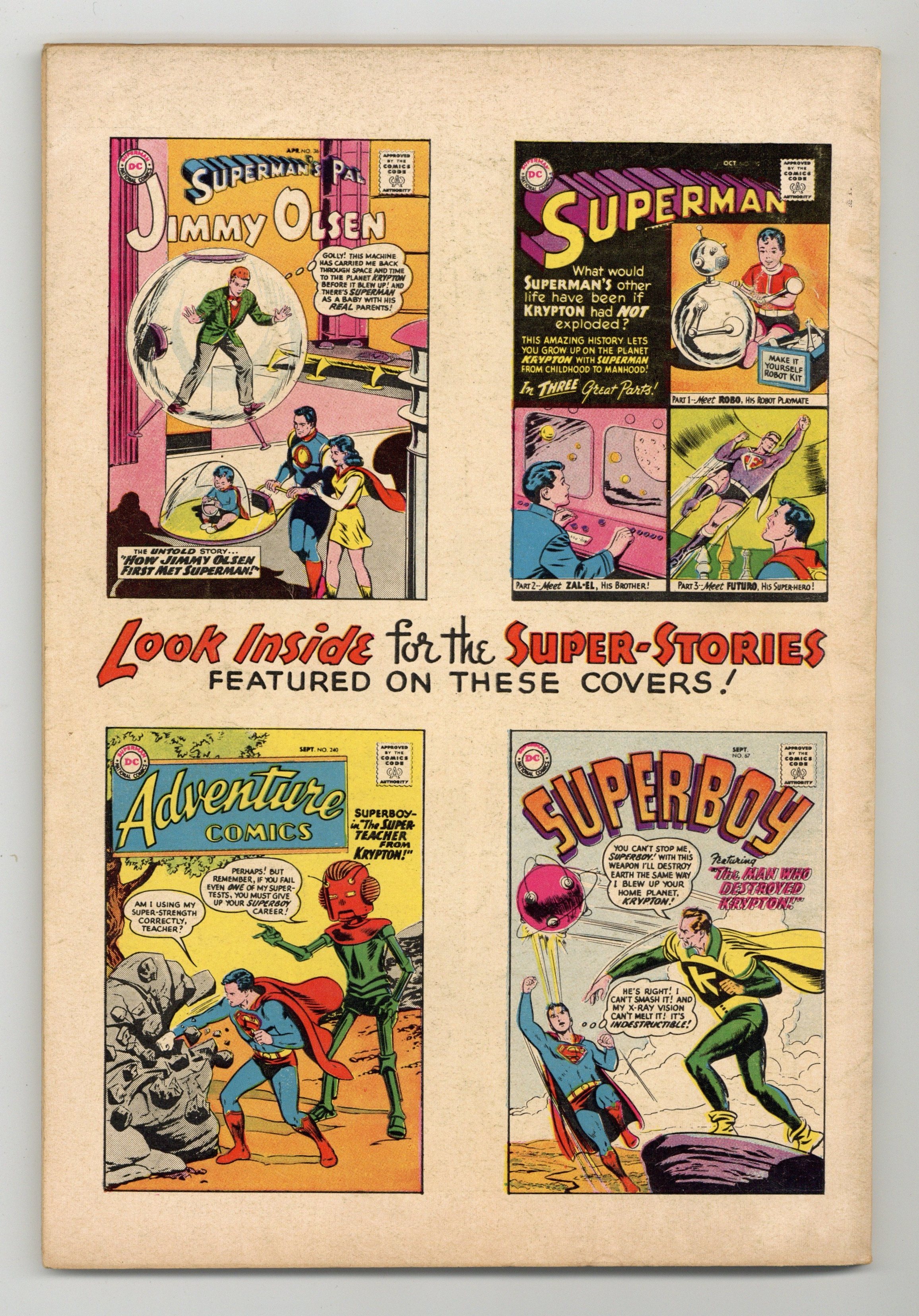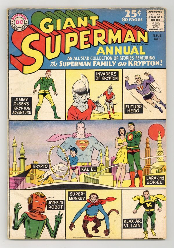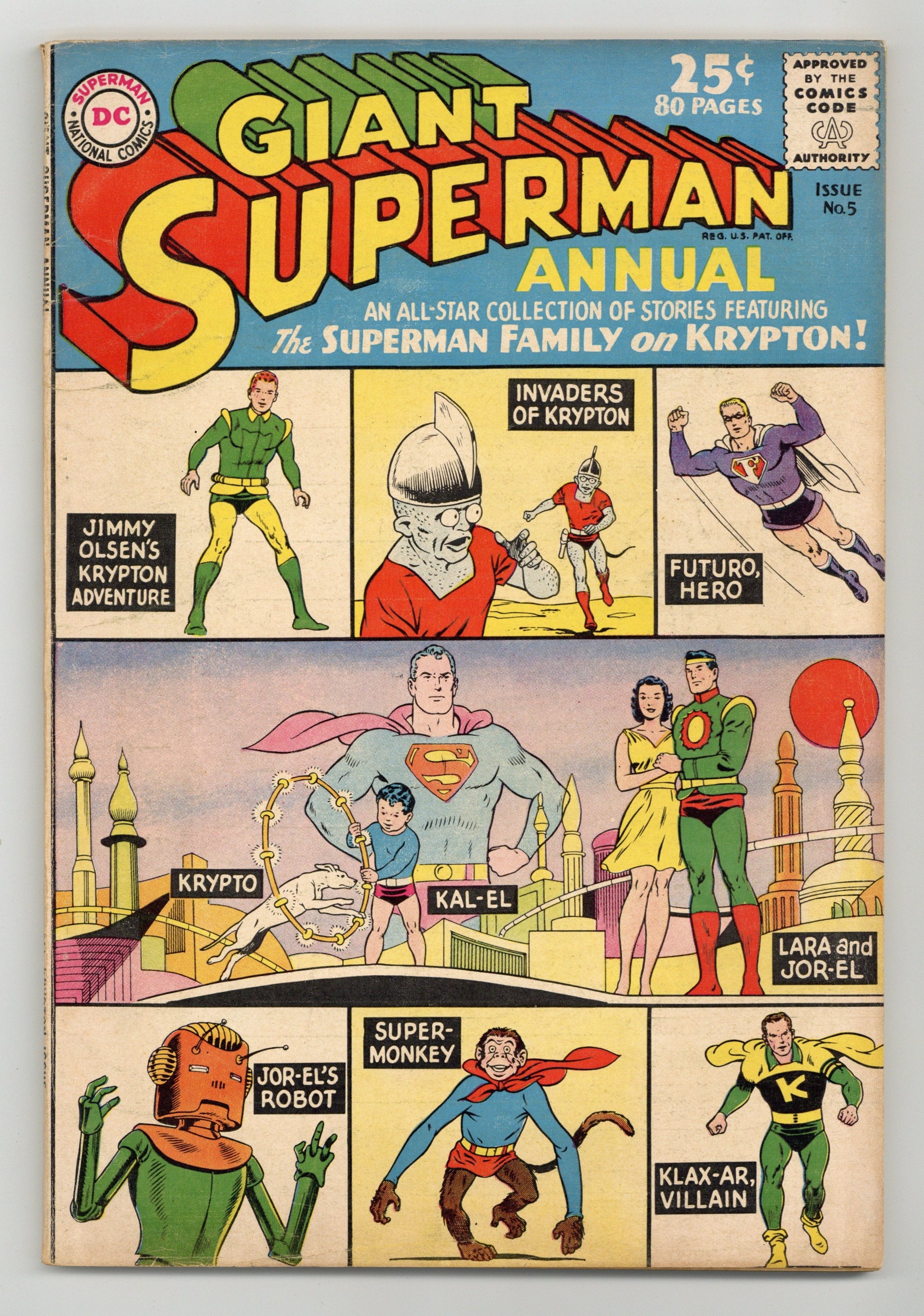 All Krypton reprints; eighty-page giant. Stories include a three-part tale ("Krypton Lives On," "Future, Super-Hero," and "The Superman of Two Worlds"), plus "The Man Who Destroyed Krypton" (from Superboy 67), "The Invasion of Krypton," "How Jimmy Olsen First Met Superman" (from Jimmy Olsen 36; art by Curt Swan), "The Super-Monkey From Krypton," "The Sleeping Beauty From Krypton," and "The Super-Teacher From Krypton" (from Adventure 240). Special features include a glossary of Kryptonian names, an illustration of the flag of Krypton, and reproductions of Superman covers from Italy, Sweden, Mexico, and Brazil. Swan cover pencils. Cover price $0.25.