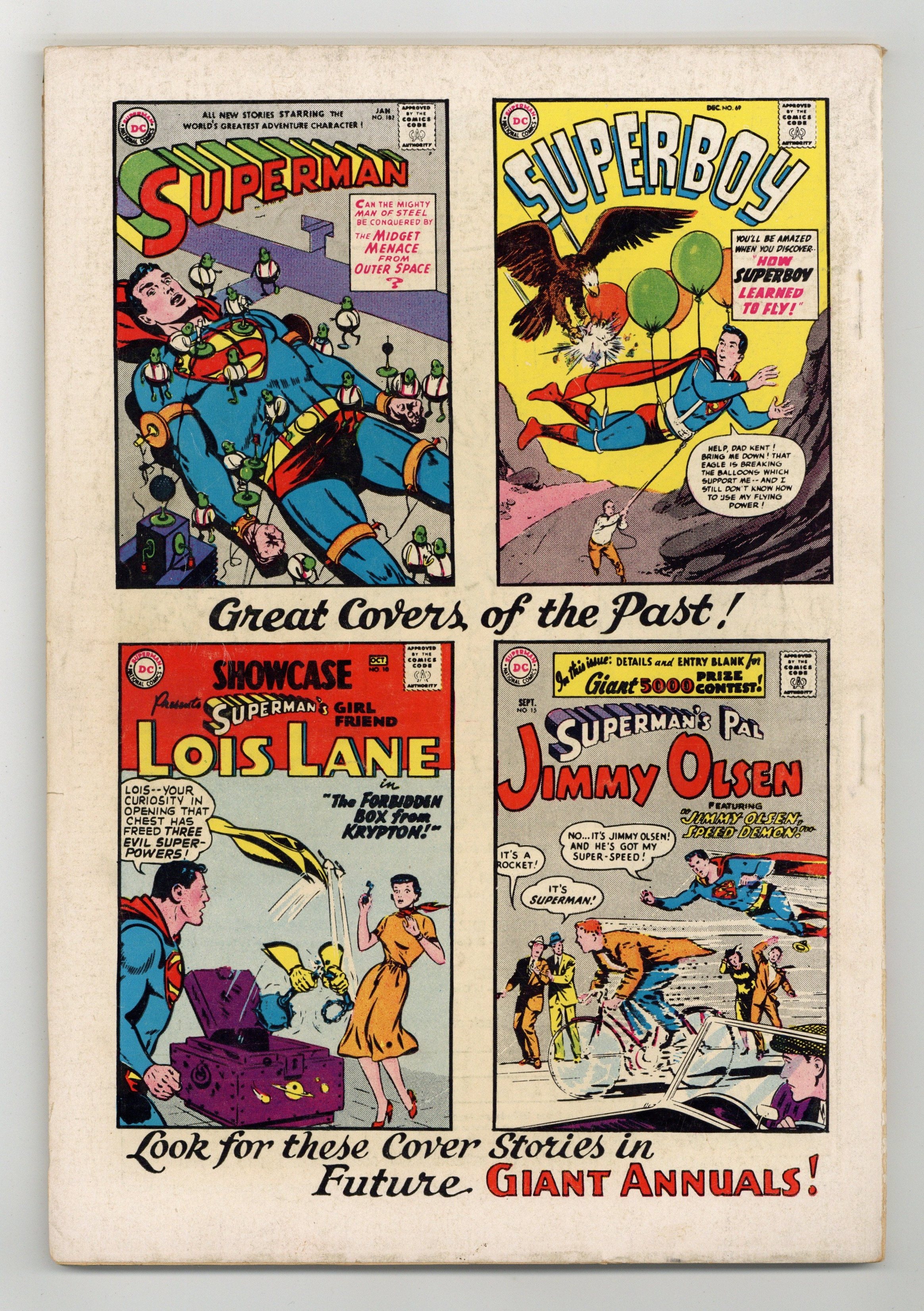 Winter 1963-64 80-page giant featuring "A Super-Collection of Untold Stories and Secret Origins!" Stories include "When Lois First Suspected Clark Was Superman," "Superboy's First Day at School," "The Amazing Superman Junior," "Mr. Mxyzptlk's First Prank," "The Untold Story of Red Kryptonite" (pencils by Curt Swan), "Prisoner of the Super-Heroes" (featuring the Legion of Super-Heroes), "The Rainbow Clark Kent," "The Origin of Superman's Super-Costume," and "Krypton's First Superman." Swan cover pencils. Cover price $0.25.