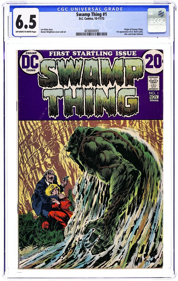 "Dark Genesis." While working on a restorative formula (that can make forests out of deserts) in the Louisiana swamps, scientist Alec Holland is killed by a bomb set off by Mr. E., who wants the formula. Shortly thereafter, a humanoid plant being rises from the swamp, created from the body of Holland, the chemicals in the formula, and the strange forces in the swamp. 1st appearance of Alec and Linda Holland. 1st appearance of Matt Cable. (Swamp Thing himself first appeared in House of Secrets 92). Script by Len Wein, art and cover by Berni Wrightson. Includes brief bios of Wein and Wrightson. Cover price $0.20.