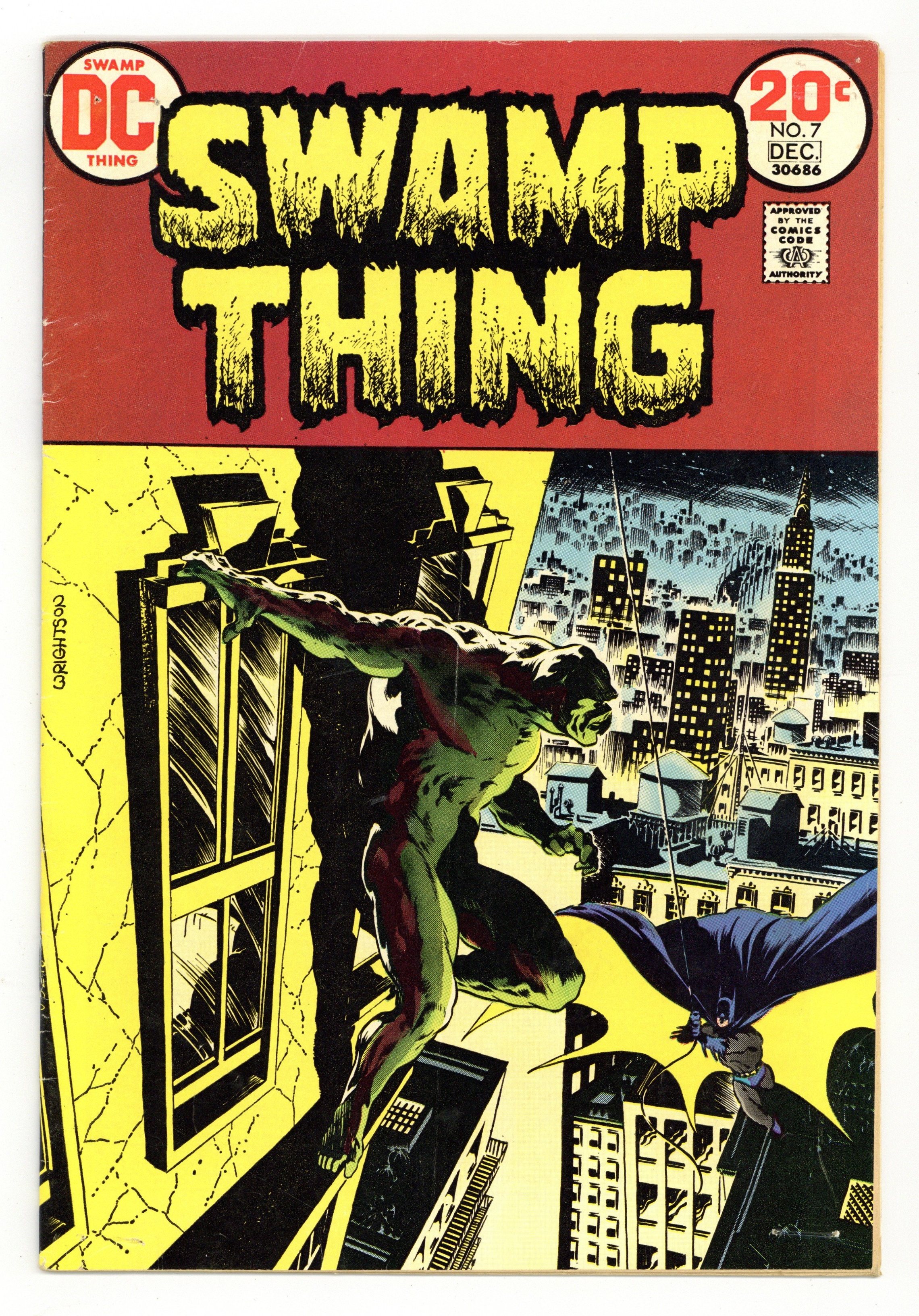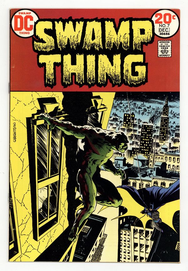 "Night of the Bat." Swamp Thing goes to Gotham City and encounters Batman. Both are after Mr. E, who is leader of the Conclave. Script by Len Wein, art and cover by Berni Wrightson. Cover price $0.20.