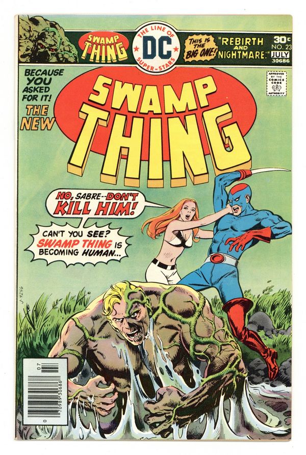 $18.00"Rebirth and Nightmare." Commander John Zero assumes the costumed identity of Sabre and is ordered by the Councilman Red of the Colossus organization to capture Swamp Thing. 1st appearance of Sabre. Meanwhile, Swamp Thing reveals his origin to Alec Holland's brother. Script by Gerry Conway, art by Nestor Redondo. Cover price $0.30.