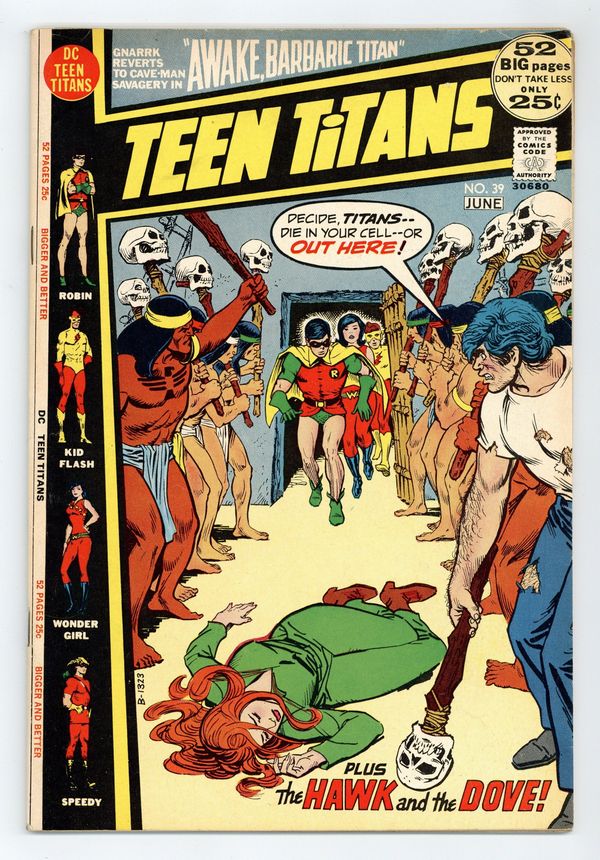 Tags: Teen Titans$12.50Written by Bob Haney. Art by George Tuska and Nick Cardy. Cover by Nick Cardy. The Teen Titans go to the Southwest United States with Mr. Jupiter and find an undiscovered Indian tribe hidden in a mountain valley. Written by Steve Skeates. Art by Gil Kane and Sal Trapani. Both Hawk and Dove try to capture the Cat but neither can capture him. Origin recap of the Hawk and Dove. 52 Pages, Full Color. Cover price $0.25.