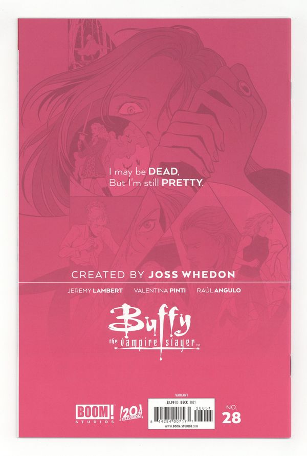 Published Aug 2021 by Boom Studios.$9.00Limited 1 for 50 Retailer Incentive Variant Cover. Written by Jeremy Lambert. Art by Marianna Ignazzi. Cover by Sam Beck. What sacrifices will have to be made to save Buffy from a world-shaking discovery? The true nature of the Mayor and Dorothy's plan is revealed and Scoobies and Slayers alike must band together to stop them, but not everyone will do so willingly. Meanwhile, the Council's machinations continue to impact the group's past, present, and most importantly future! 24 pages, full color. Cover price $3.99.
