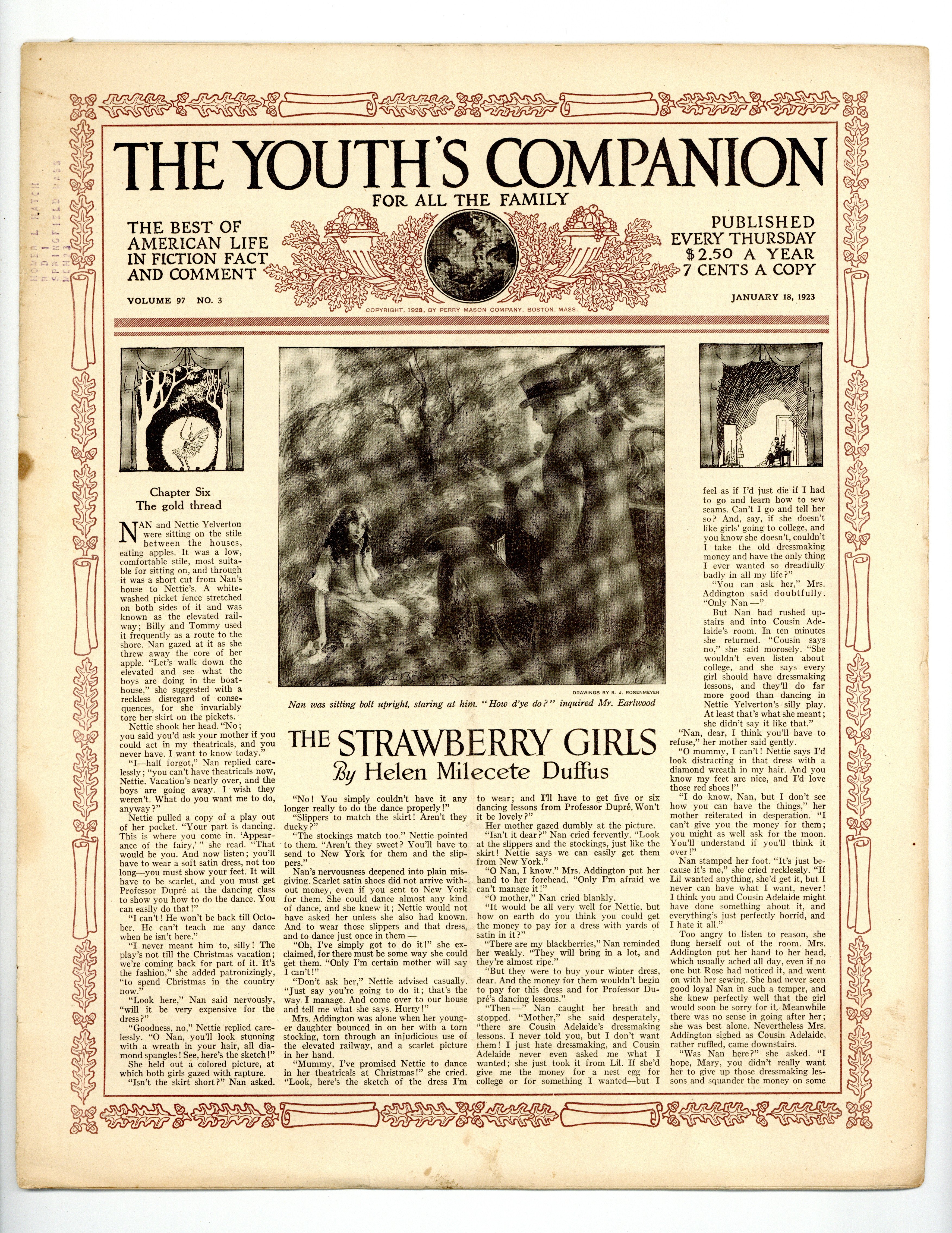Published Jan 1923 by Perry Mason Company.$2.50Volume 97, Issue 3 - January 18, 1923. Cover by B.J. Rosenmeyer. This issue's stories include; "The Strawberry Girls" by Helen Milecete Duffus, "Brain vs. Brawn" by Ruth and Robert Osborne, "The Fourth Bride" by Naomi E. Butler, "A Message to Chief Joseph" by Frank Robertson, and more. 11" x 13.5", 16 pages, B&W. Cover price $0.07.