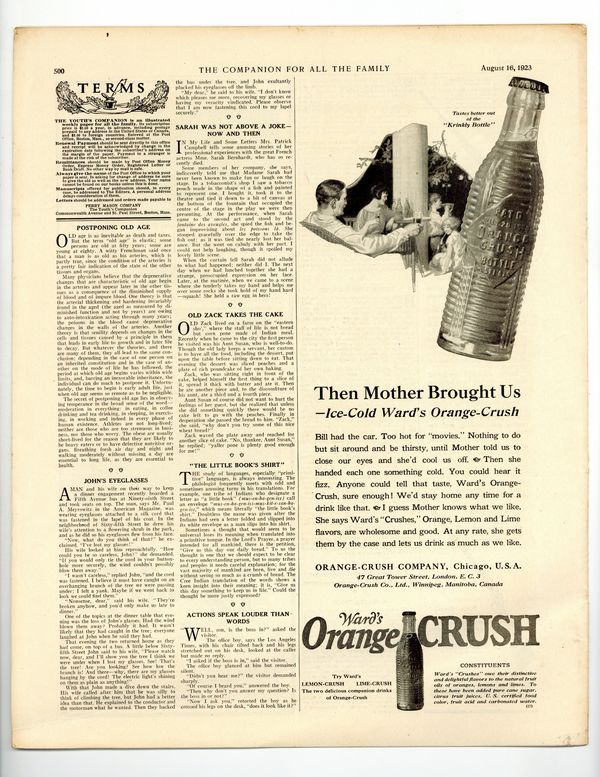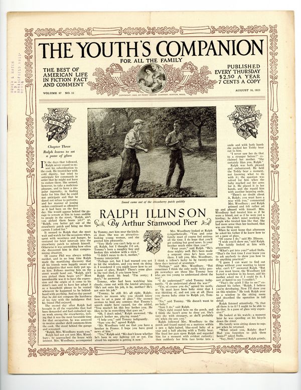 Volume 97, Issue 33 - August 16, 1923. Cover by Emlen McConnell. This issue's stories include; "Ralph Illinson: Chapter III" by Arthur Stanwood Pier, "A Change of Diet" by Edwin Cole, "More Than Raiment" by Ida J. Burgess, "Stopping a Squealer" by Hugh F. Grinstead, and more. 11" x 13.5", 16 pages, B&W. Cover price $0.07.