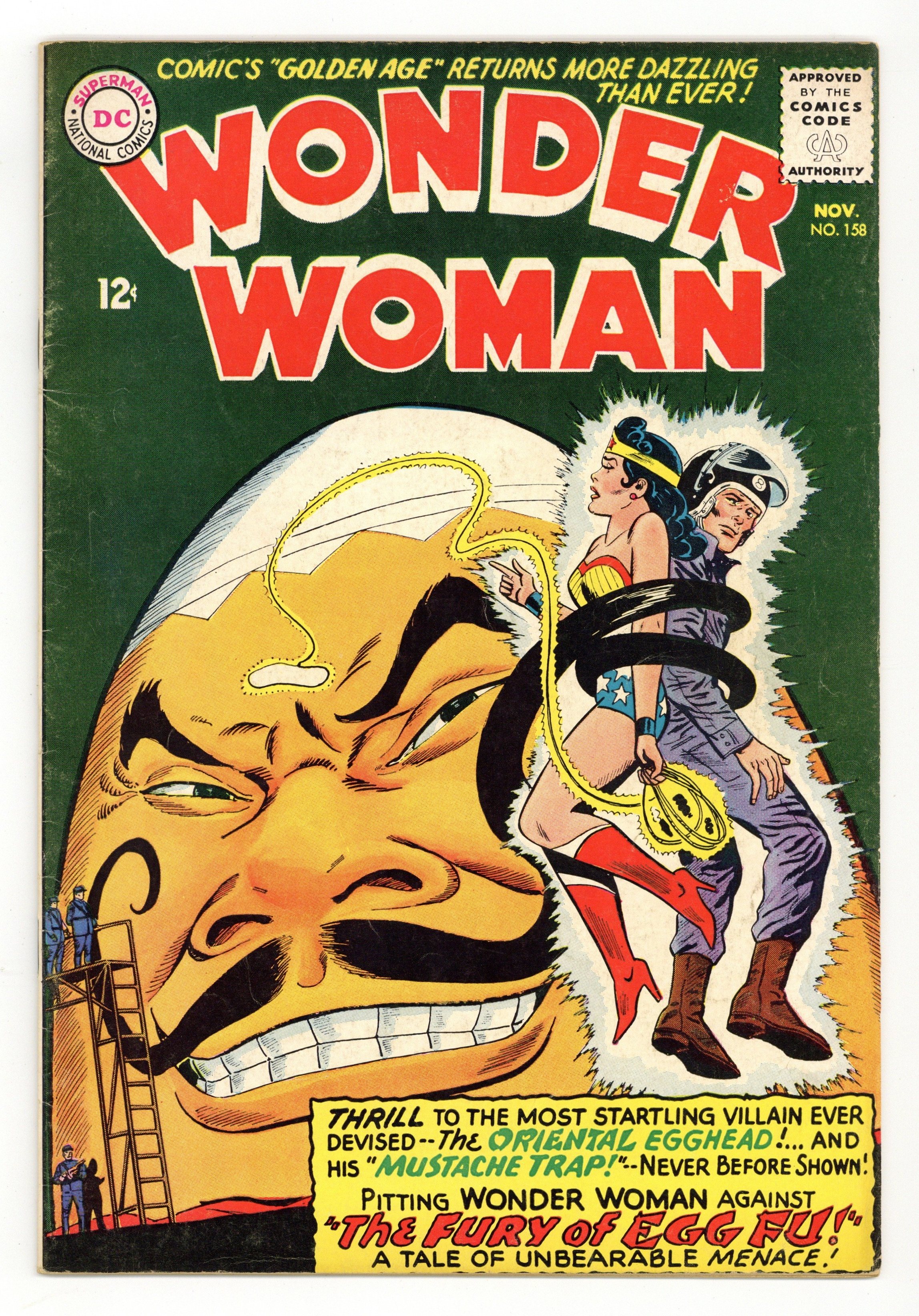 Cover pencils by Ross Andru, inks by Mike Esposito. "The Fury of Egg Fu!", script by Robert Kanigher, pencils by Ross Andru, inks by Mike Esposito; Wonder Woman takes herself and Steve Trevor off Paradise Island (Steve, having been on a table, has not touched ground and is thus not in violation of Aphrodites Law); They opt to return to Oolong and battle Egg Fu; On the way, they see a tiny meteor of anti-matter destroy a large meteor of positive matter, and deduce that touching anti-matter might rid them of their explosive power; On Oolong, they fight off Red Chinese troops and tanks, but Egg Fu snatches them and uses their power against each other, rendering them both unconscious and then tossing them away; But as they arc skyward, they contact another piece of anti-matter and their explosive power is neutralized. Wonder Woman encircles Egg Fu with her magic lasso. "The End - or the Beginning!", script by Robert Kanigher, pencils by Ross Andru, inks by Mike Esposito; Editor Kanigher summons the cast to his office and fires them; announces a new direction for Wonder Woman. Rocky and Bullwinkle star in a one-page Cheerios ad. 36 pages, Full Color. Cover price $0.12.