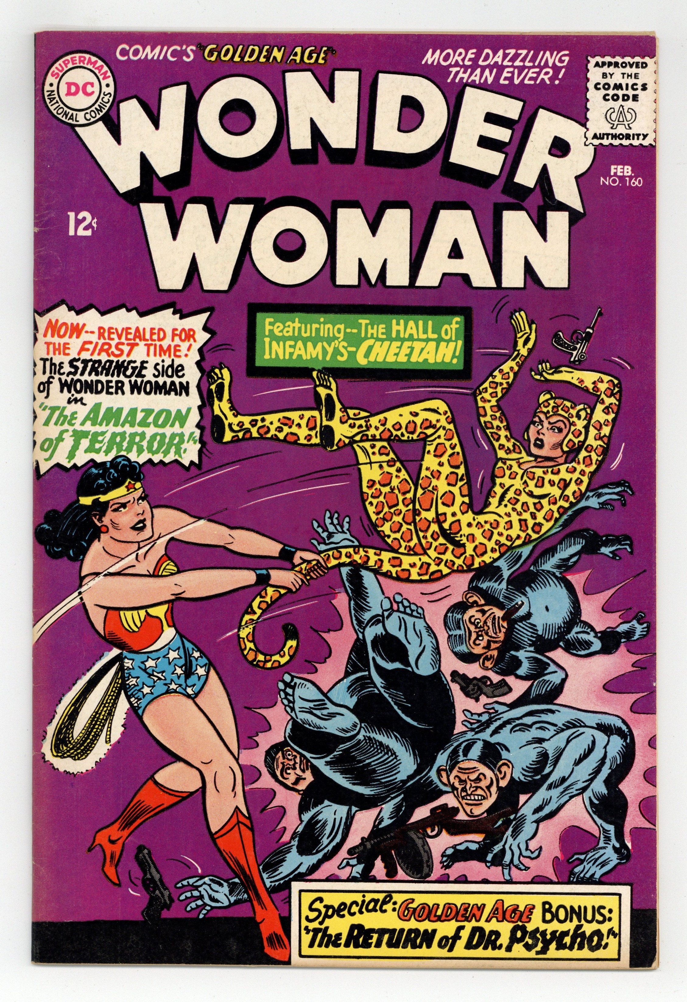 Cover pencils by Ross Andru, inks by Mike Esposito. "The Amazon of Terror," script by Robert Kanigher, pencils by Ross Andru, inks by Mike Esposito; Wonder Woman and Steve Trevor stop the Cheetah and her gang from robbing a zoo of its priceless extinct animal exhibit for a client; But the Cheetah escapes, and later hypnotizes Trevor into smooching with her; When Wonder Woman sees them, as the Cheetah had planned, she is tear-stricken and upset, allowing the villainess to take her by surprise, steal her magic lasso, and encircle her with it; Wonder Woman, enslaved by the Cheetah, is forced to take her and Steve to the Cheetahs private island. "Dr. Psycho's Revenge," script by Robert Kanigher, pencils by Ross Andru, inks by Mike Esposito; To show Athena and Aphrodite that Wonder Womans beauty and wisdom, derived from goddesses, are nothing compared to the god-derived powers of strength and speed she possesses, Mars steals her Herculean strength and Mercurian speed temporarily and gives them to the woman-hating Dr. Psycho, who has been rejected by all women as a suitor because of his ugliness. 36 pages, Full Color. Cover price $0.12.