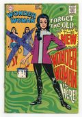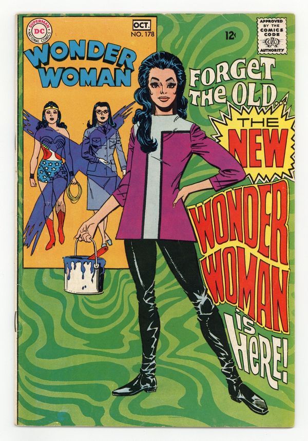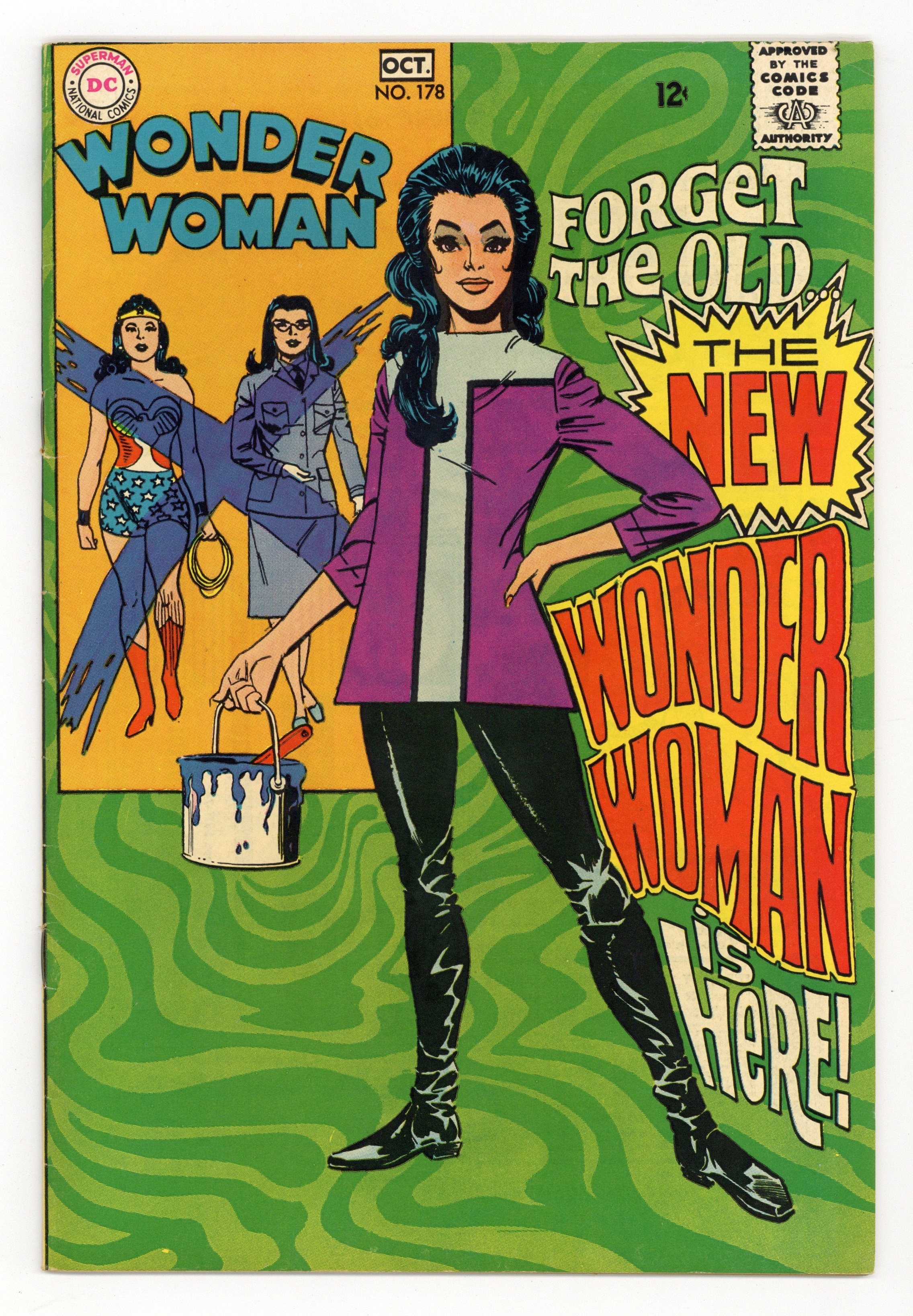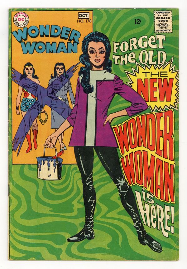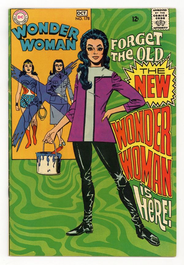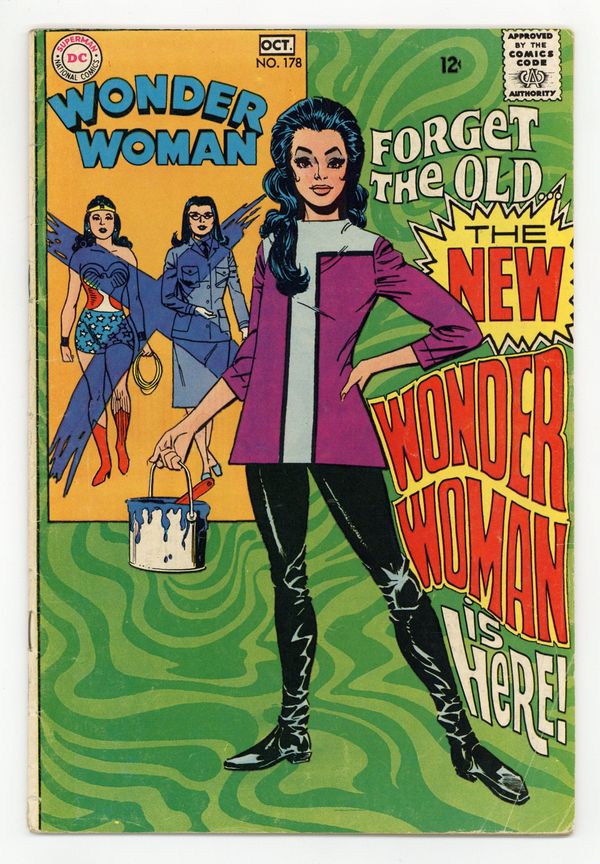 "Wonder Woman's Rival." When Steve Trevor is suspected of murder, Wonder Woman must investigate the modern social scene in the most up-to-date fashions as Diana Prince. Though she successfully clears Steve, once she sees Steve's reaction to the new Diana Prince, Wonder Woman decides that she needs to update her heroic identity, too. Written by Denny O'Neil, with art by Mike Sekowsky and Dick Giordano. (Note: Start of a new look for Wonder Woman.) Characters: Wonder Woman [Diana Prince]; Steve Trevor; Roger Seely; Alex Block; Buck; Miss Carvan. Cover by Mike Sekowsky and Dick Giordano. 36 pages, Full Color. Cover price $0.12.