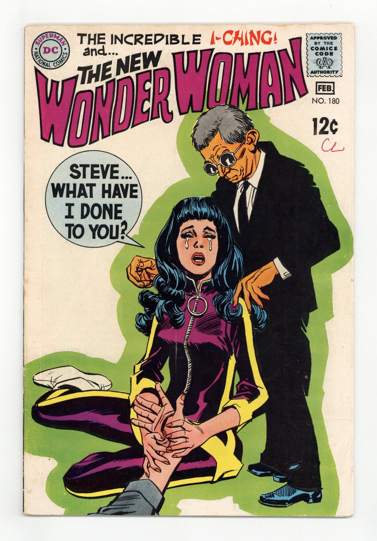 Tags: Wonder Woman$17.50Cover pencils by Mike Sekowsky, inks by Dick Giordano. "A Death for Diana!", script by Denny O'Neil (plot & dialogue), pencils by Mike Sekowsky (art & continuity), inks by Dick Giordano; Private eye Tim Trench joins Diana and Ching in their pursuit of Doctor Cyber and helps them fight off an attack by the villain's henchmen; After returning to her training, Diana receives a call purportedly from the hospital, saying Steve Trevor is asking for her, but it is a trap; After escaping a submerged taxi, Diana rejoins Trench and Ching who receive another tip about Cyber's whereabouts. 36 pages, Full Color. Cover price $0.12.