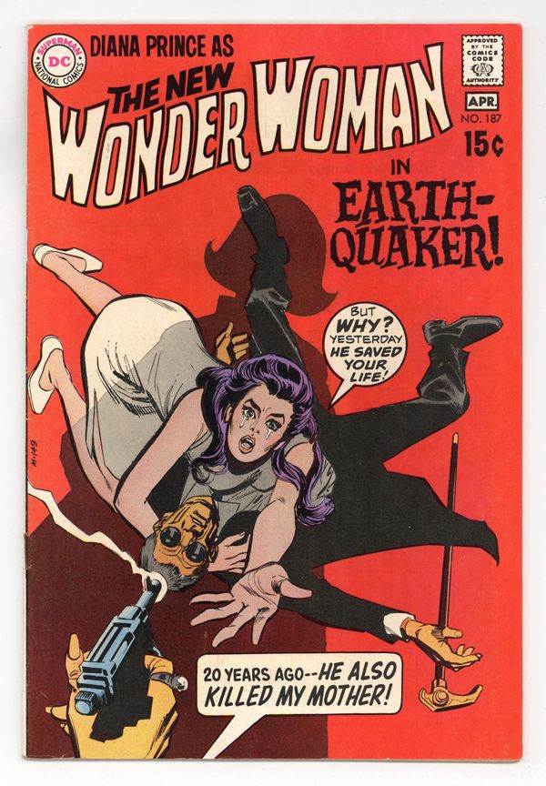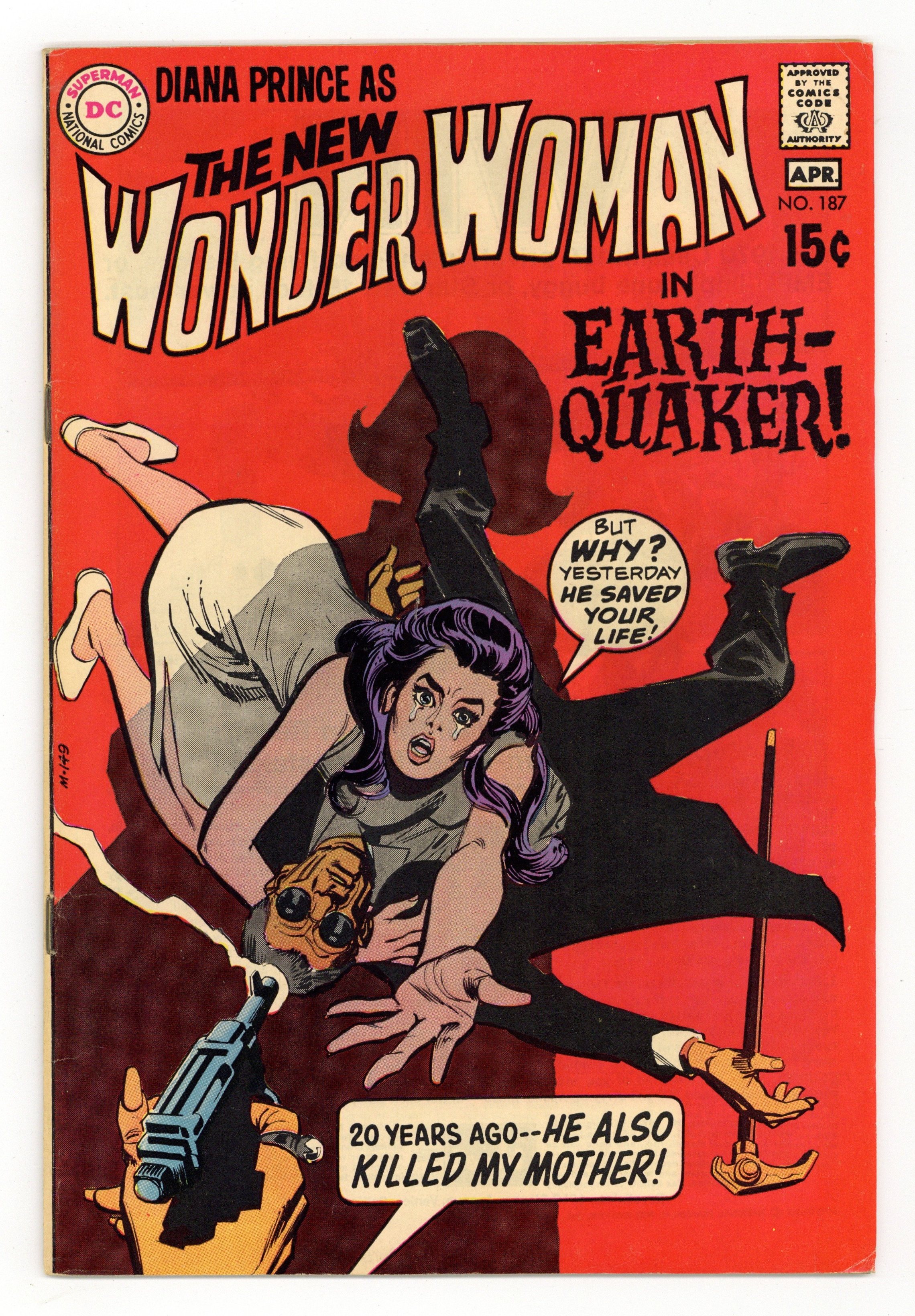 Cover pencils by Mike Sekowsky, inks by Dick Giordano. "Earthquaker!", script and pencils by Mike Sekowsky, inks by Dick Giordano; I-Ching receives a call from an old friend in Hong Kong, asking for help; The only plane he and Diana can charter for the flight is owned and flown by another of Chings old friends, Patrick McGuire, who is also carrying a lady named Lu Shan to Hong Kong; During the flight, members of the Tiger Tong criminal clan emerge from crates in the cargo hold and attempt to take over the plane, but are repelled by Diana and her friends and accidentally thrown off the plane; Lu Shan says that the Tiger Tong were trying to get her "employers" treasure, but I-Ching, feeling half of a shattered gem on a ring on Lu Shans finger, has Diana fit it together with another half-gem he carries on a chain around his neck. Letter to the editor from comics writer Martin Pasko. Statement of ownership--average print run 323,000; average paid circulation 171,197. 36 pages, Full Color. Cover price $0.15.