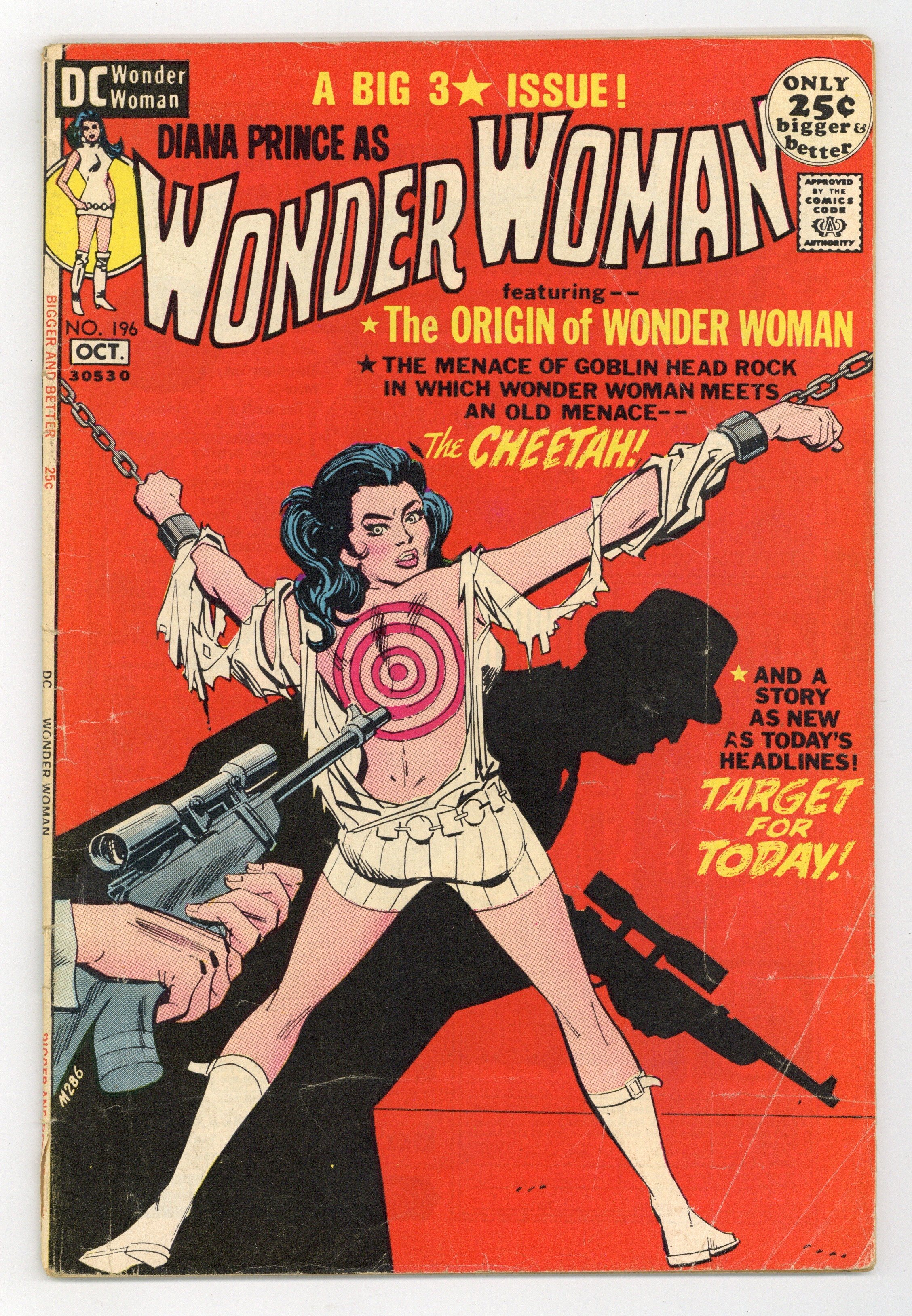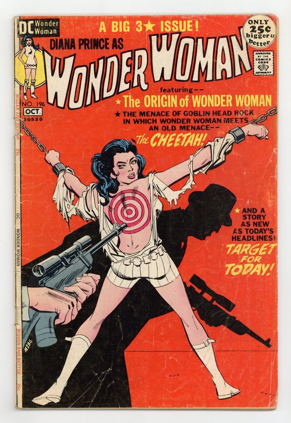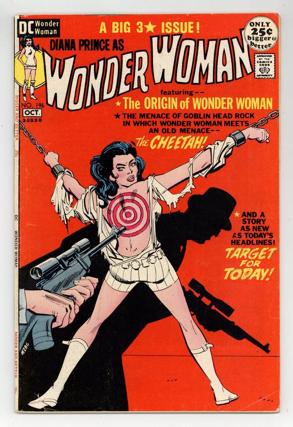 48-page giant. Cover pencils by Mike Sekowsky, inks by Dick Giordano. "Target for Today?", script and pencils by Mike Sekowsky, inks by Dick Giordano; A man dying of gunshot wounds stumbles into Dianas boutique, reveals that he is a secret agent for a government agency headed by General Stuart, for whom I-Ching also once worked, and tells her that Stuart must learn of an assassination planned on the Koronian ambassador; story from All Star #8 (6 out of the 9 pages). "Introducing Wonder Woman," script by William Marston, art by Harry G. Peter; When a man crashes on Paradise Island, the Amazons compete to see who will take him back to Man's World, and Queen Hippolyte's daughter Diana wins the competition to return him in the guise of Wonder Woman. "The Stormy Menace of Goblin Head Rock!", art by Harry G. Peter; previously unpublished Golden Age story. 52 pages, Full Color. Cover price $0.25.