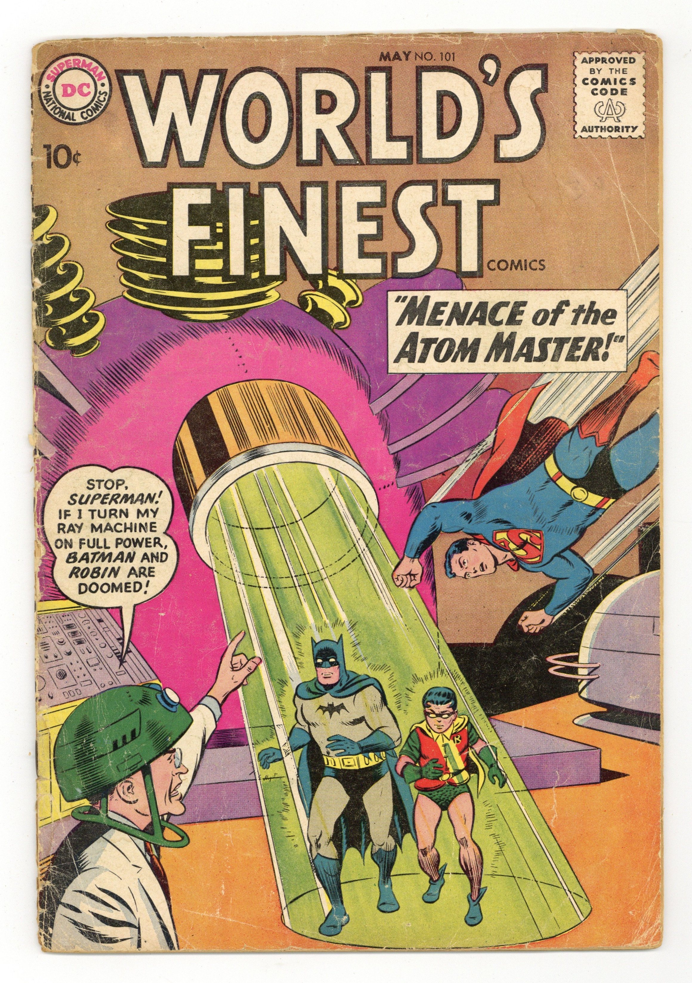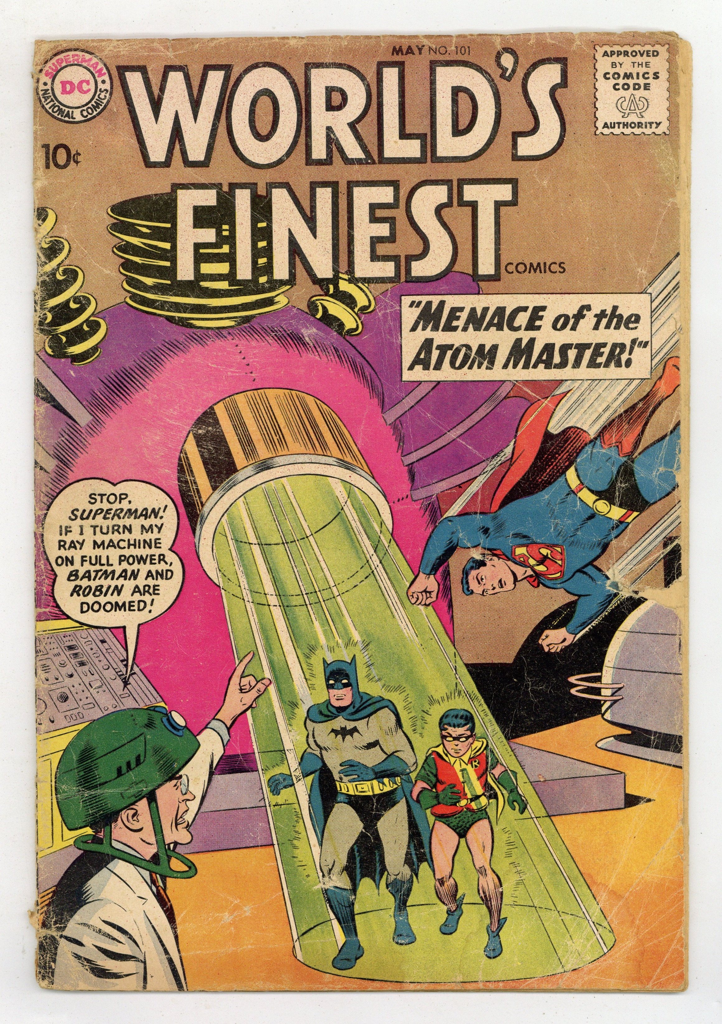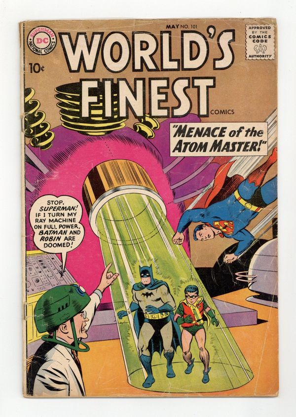 Cover pencils by Curt Swan, inks by Stan Kaye. The Menace of the Atom-Master, script by Bill Finger, pencils by Dick Sprang, inks by Sheldon Moldoff; The Atom-Master has developed the means to create giant illusions which begin to panic Metropolis and Gotham City, distracting Superman and Batman. Meanwhile, his men are able to steal enough to give him the funds to improve his machine so that he can create physical objects with his thoughts. Showcase #20 ad. Do You Make Life Hard for Yourself? public service announcement, script by Jack Schiff, art by Bernard Baily. Ollie humor page by Henry Boltinoff. Amazing Stand at Fort Scarecrow starring Tomahawk, art by Bob Brown. Calling All Pilots text article. Battle of the Useless Inventions starring Green Arrow, art by Lee Elias; Mr. Vention is buying up "useless" inventions that he then uses for his robberies. 36 Pages, Full Color. Cover price $0.10.