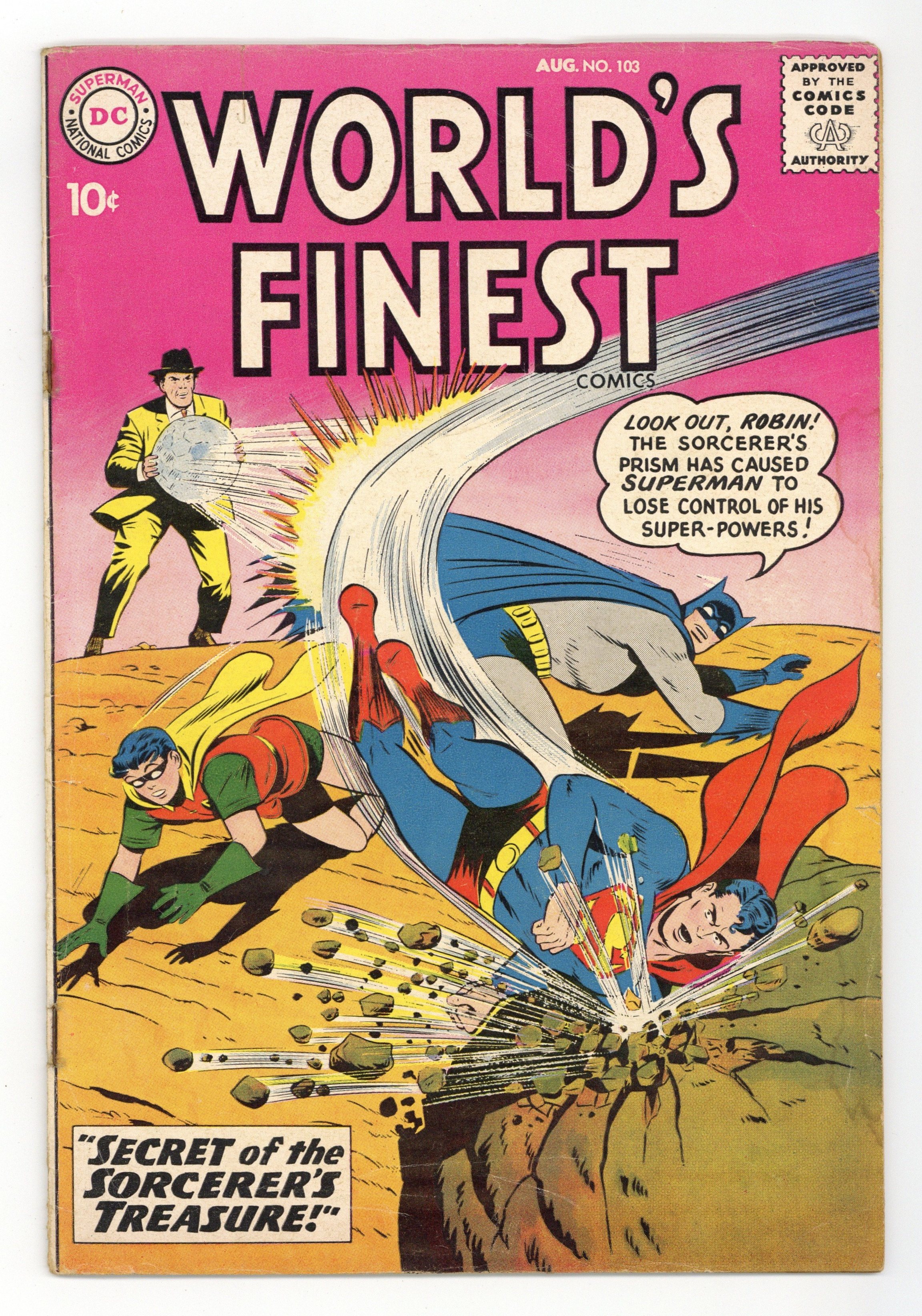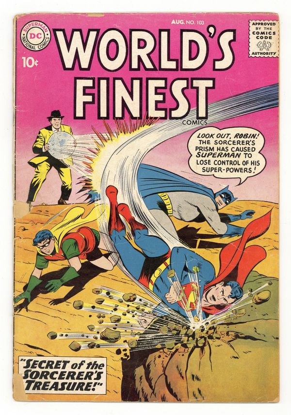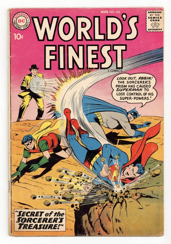 Tags: Superman$34.50Cover pencils by Curt Swan, inks by Stan Kaye. The Secret of the Sorcerer's Treasure starring Superman and Batman, script by Bill Finger, pencils by Dick Sprang, inks by Sheldon Moldoff; Atkins and Bork purchase a map that leads them to an ancient sorcerer's weapons. Tips on Summer Fun! public service announcement starring Peter Porkchops, script by Jack Schiff, art by Rube Grossman. Little Pete humor page by Henry Boltinoff. The Menace of the Metal Monitor starring Tommy Tomorrow, script by Jack Miller, art by Jim Mooney. Challenge Of The Phantom Bandit starring Green Arrow, script by Bob Haney, art by Lee Elias; After stealing some chemicals from a professor, Joey Sanders becomes the Phantom Bandit, who can't be touched by Green Arrow and Speedy. 36 Pages, Full Color. Cover price $0.10.