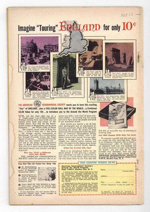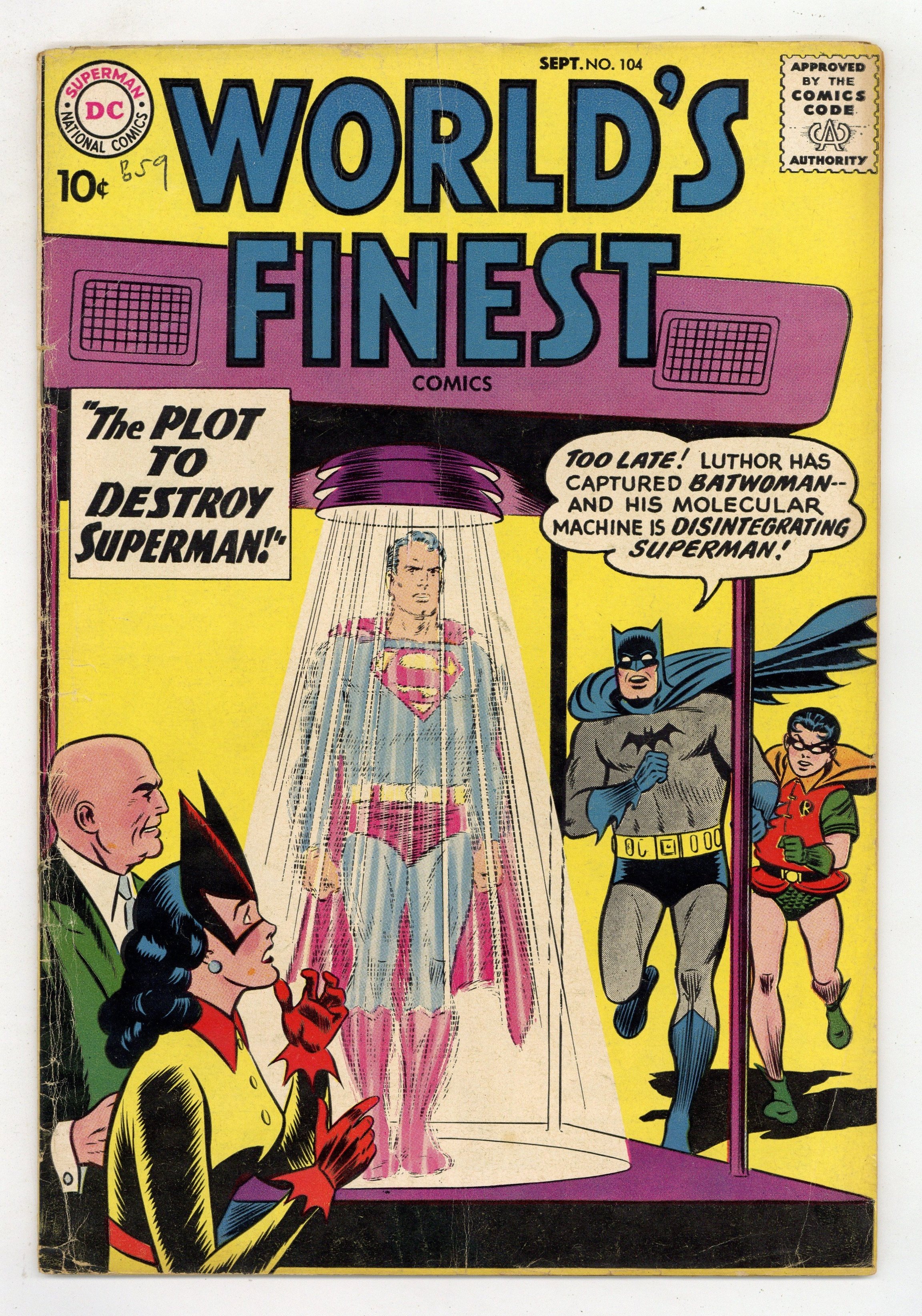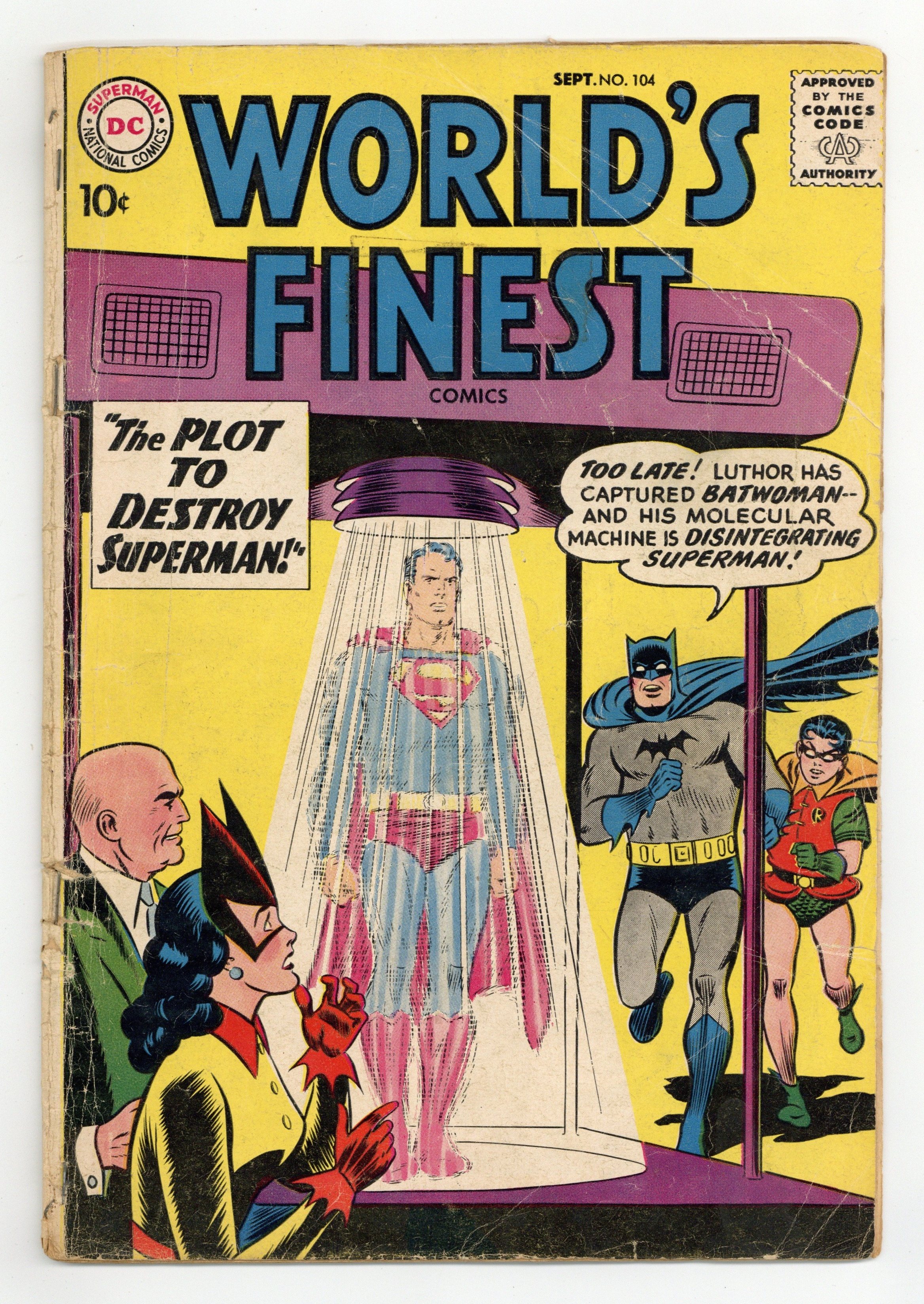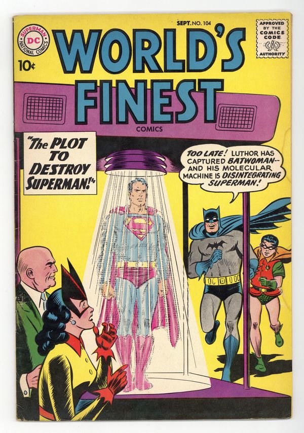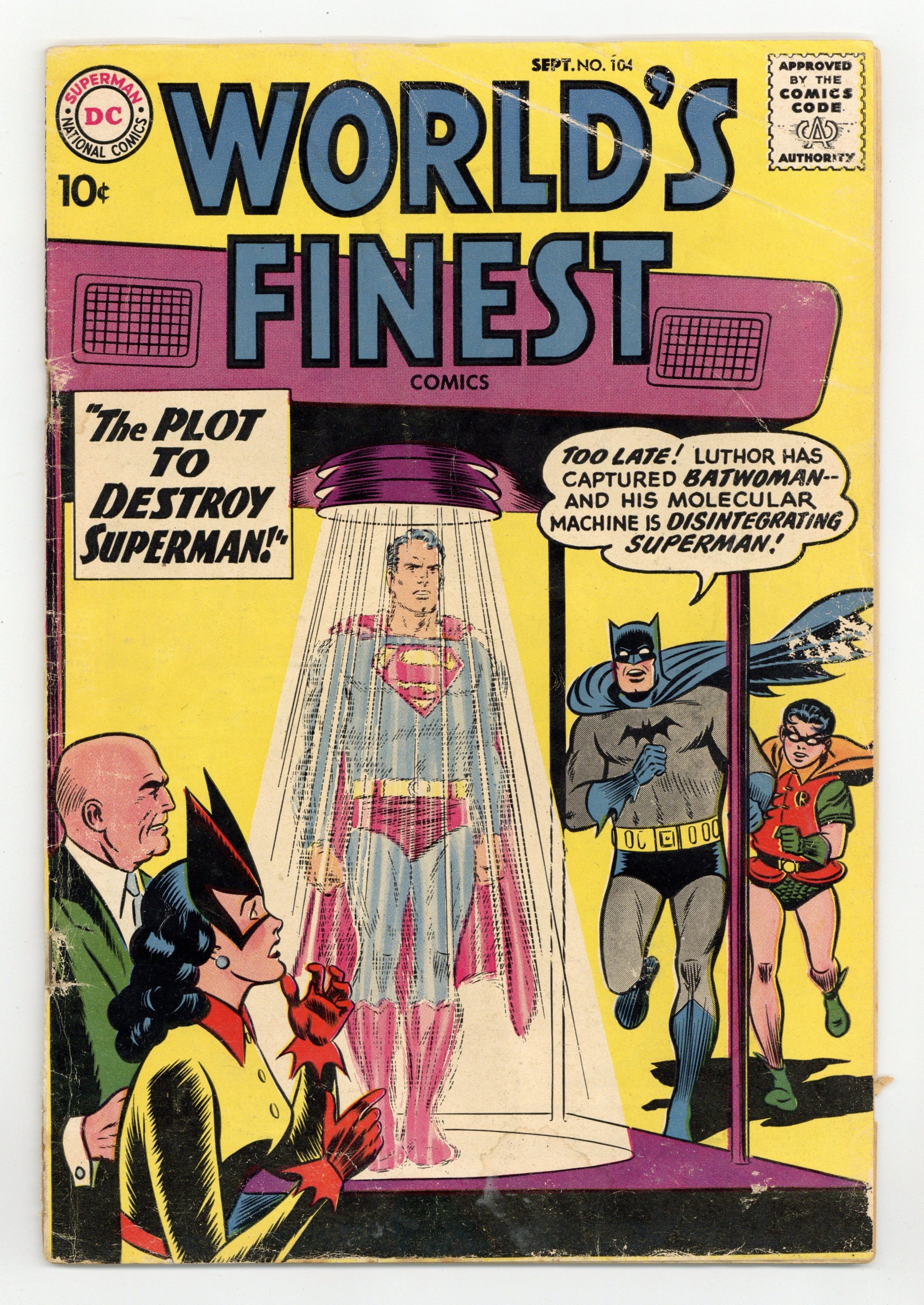Cover pencils by Curt Swan, inks by Stan Kaye. The Plot to Destroy Superman, script by Bill Finger, pencils by Dick Sprang, inks by Sheldon Moldoff; Superman, Batman, Batwoman and Robin are scheduled to display crime-fighting inventions of the future at an exhibit of what future Gotham will be like. Lex Luthor, disguised as an inventor of one of the inventions, tries to have Superman disintegrated. Hy Wire humor page by Henry Boltinoff. Prisoners of the Amazon Asteroid starring Tommy Tomorrow, script by Jack Miller, art by Jim Mooney. Alias Chief Magic Bow starring Green Arrow, art by Lee Elias; Green Arrow and Speedy help an Indian tribe by posing as an ancient warrier, Chief Magic Bow, and performing various "magic" tricks with their special arrows. 36 Pages, Full Color. Cover price $0.10.