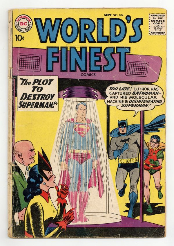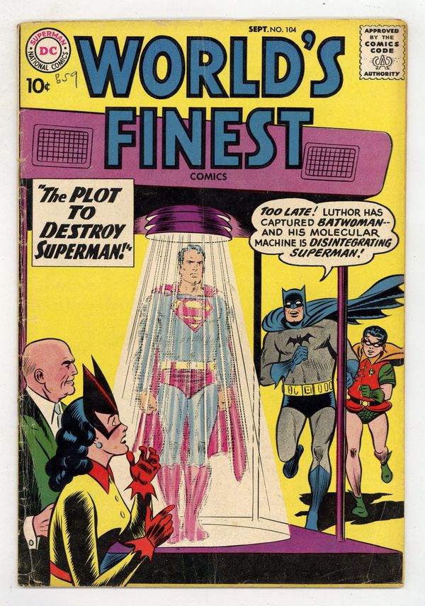 Tags: Superman$30.00Cover pencils by Curt Swan, inks by Stan Kaye. The Plot to Destroy Superman, script by Bill Finger, pencils by Dick Sprang, inks by Sheldon Moldoff; Superman, Batman, Batwoman and Robin are scheduled to display crime-fighting inventions of the future at an exhibit of what future Gotham will be like. Lex Luthor, disguised as an inventor of one of the inventions, tries to have Superman disintegrated. Hy Wire humor page by Henry Boltinoff. Prisoners of the Amazon Asteroid starring Tommy Tomorrow, script by Jack Miller, art by Jim Mooney. Alias Chief Magic Bow starring Green Arrow, art by Lee Elias; Green Arrow and Speedy help an Indian tribe by posing as an ancient warrier, Chief Magic Bow, and performing various "magic" tricks with their special arrows. 36 Pages, Full Color. Cover price $0.10.