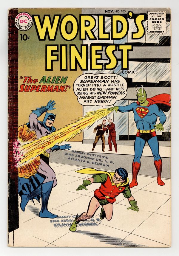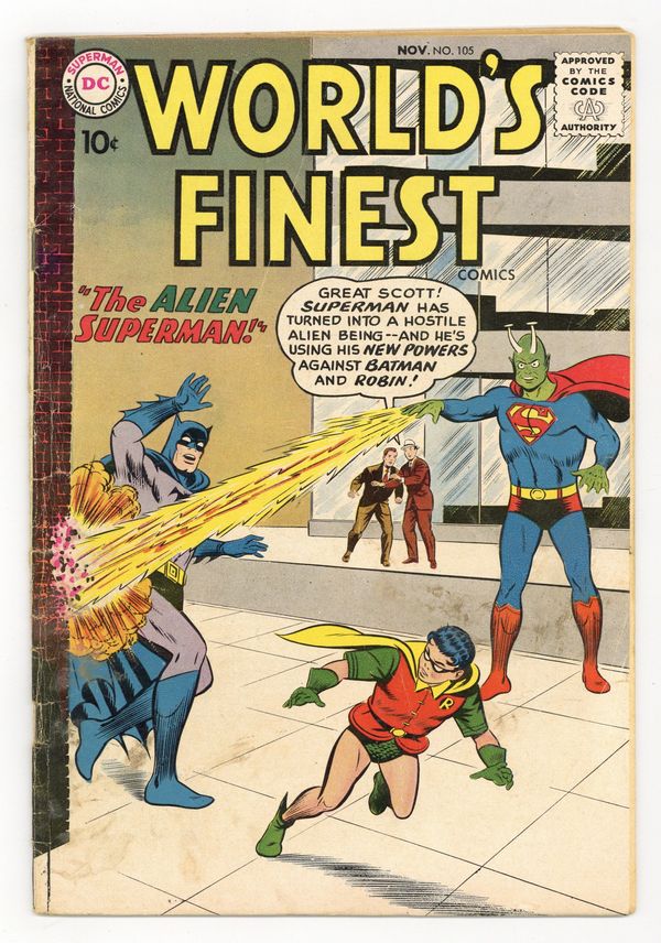 Cover pencils by Curt Swan, inks by Stan Kaye. The Alien Superman starring Superman and Batman, script by Bill Finger, pencils by Dick Sprang, inks by Sheldon Moldoff; Superman suddenly spins a cocoon around himself and then emerges as an alien version of himself, with no memories of his past. It Happened in Illinois, script and art by Joe Kubert. New Stars for "Old Glory" public service announcement, script by Jack Schiff, art by Bernard Baily. The Reckless Rookie starring Tommy Tomorrow, script by Otto Binder, art by Jim Mooney. Ollie humor page by Henry Boltinoff. The Mighty Mr. Miniature, script by Ed Herron, art by Lee Elias; Green Arrow and Speedy must stop Mr. Miniature, who uses toys to help him in his crimes. 36 Pages, Full Color. Cover price $0.10.