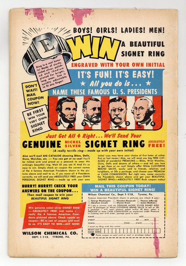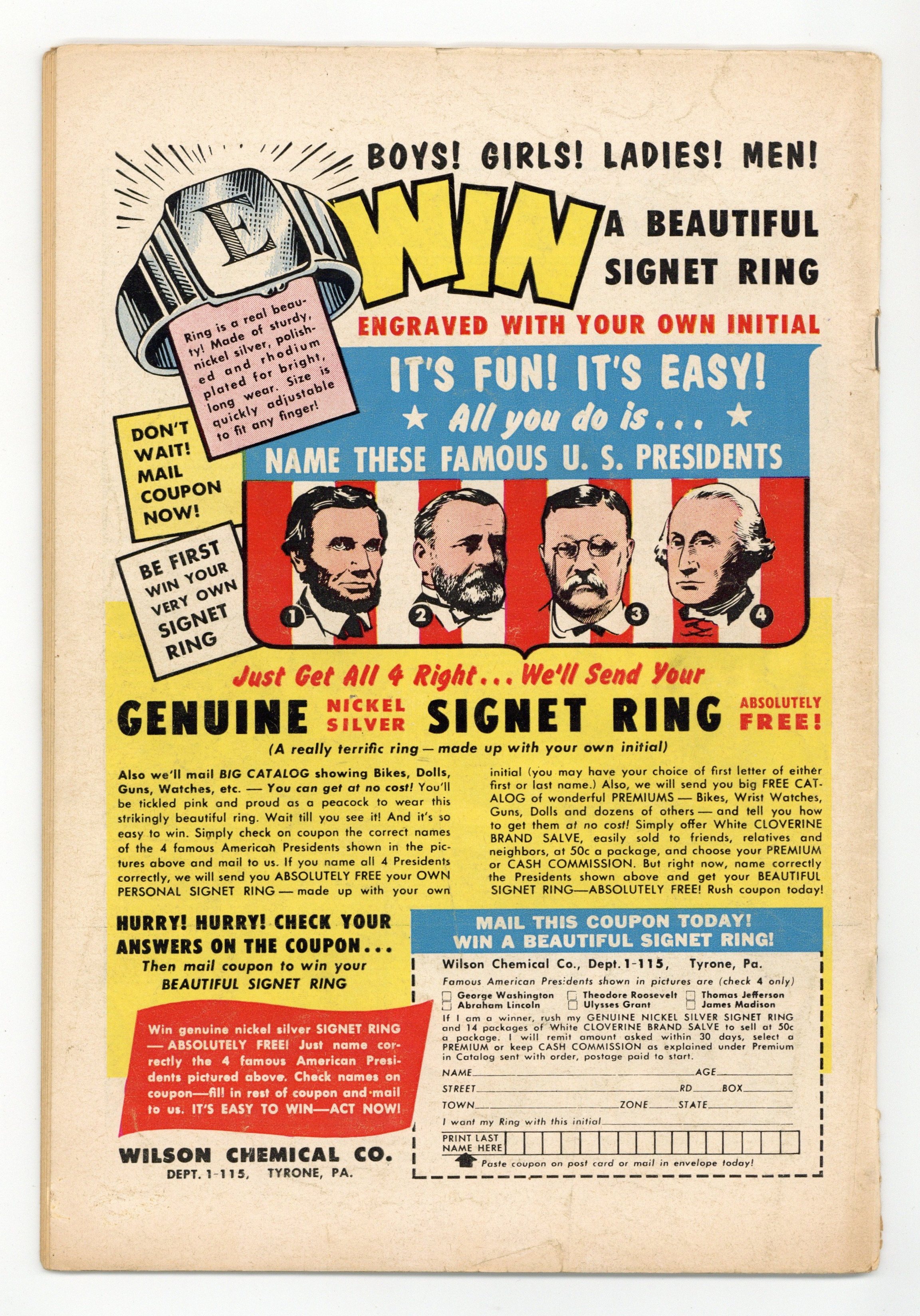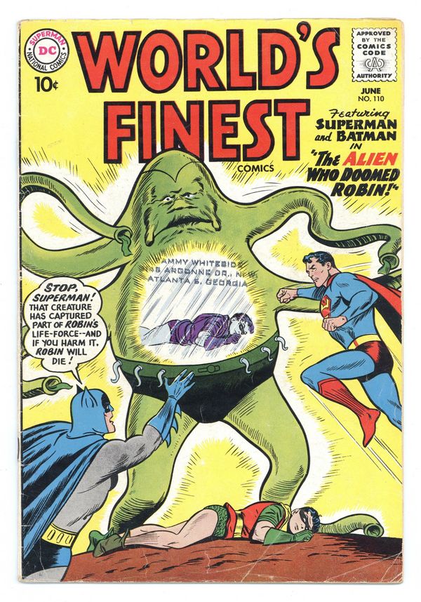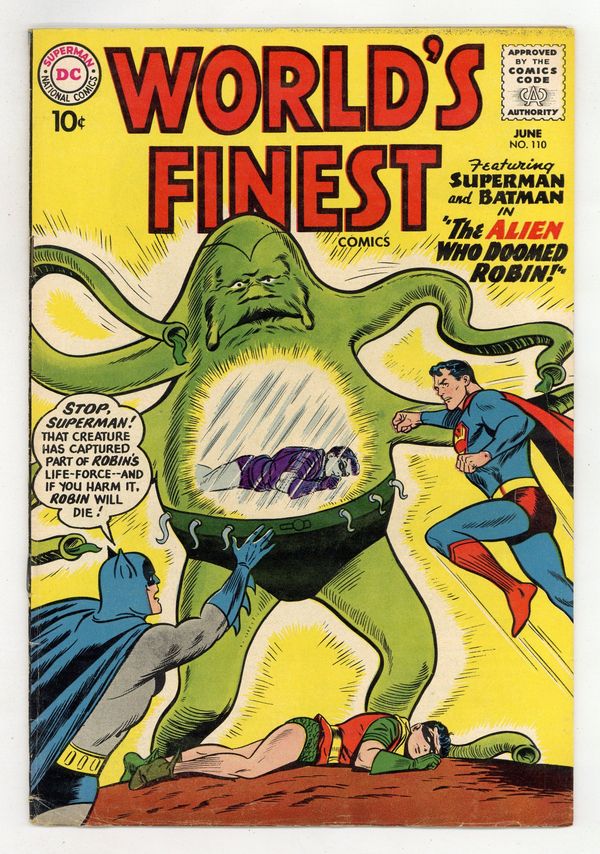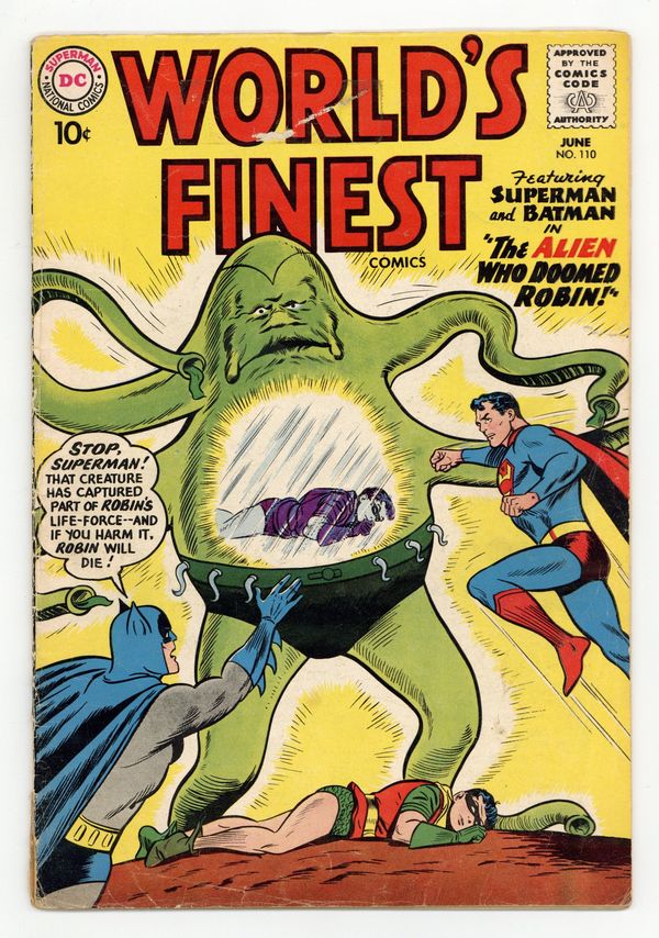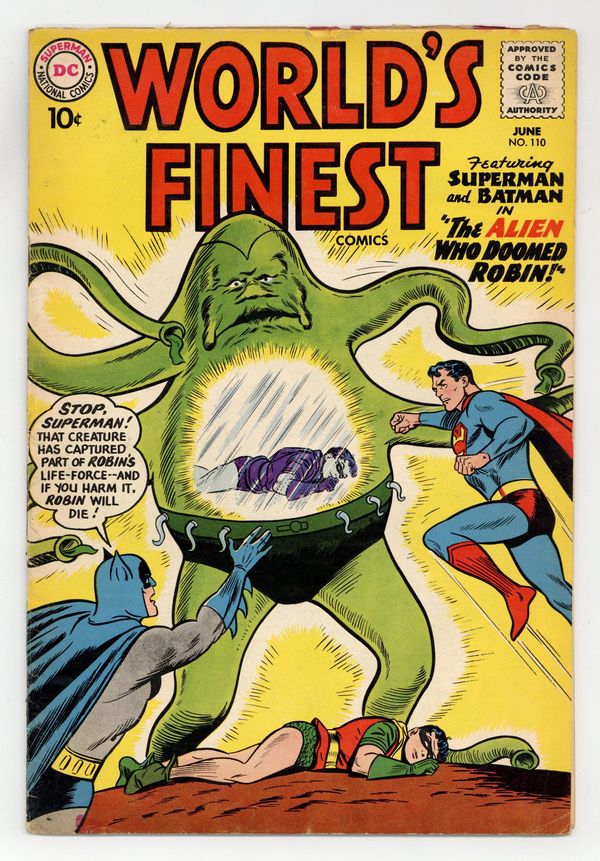 Tags: Superman$44.50Cover pencils by Curt Swan, inks by Sheldon Moldoff. The Alien Who Doomed Robin starring Superman and Batman, script by Jerry Coleman, pencils by Dick Sprang, inks by Sheldon Moldoff; An alien arrives on Earth and starts shrinking buildings and stealing them; He plans to enlarge them on his homeworld and create a tourist attraction in space; Superman, Batman and Robin must stop him and return the shrunken buildings to their proper locations. Ollie humor page by Henry Boltinoff. The Robot Raiders starring Tommy Tomorrow, art by Jim Mooney. The Sinister Spectrum Man starring Green Arrow, script by Ed Herron, art by Lee Elias; Green Arrow and Speedy must find a way to stop the Spectrum Man and his gang of thieves. 36 Pages, Full Color. Cover price $0.10.