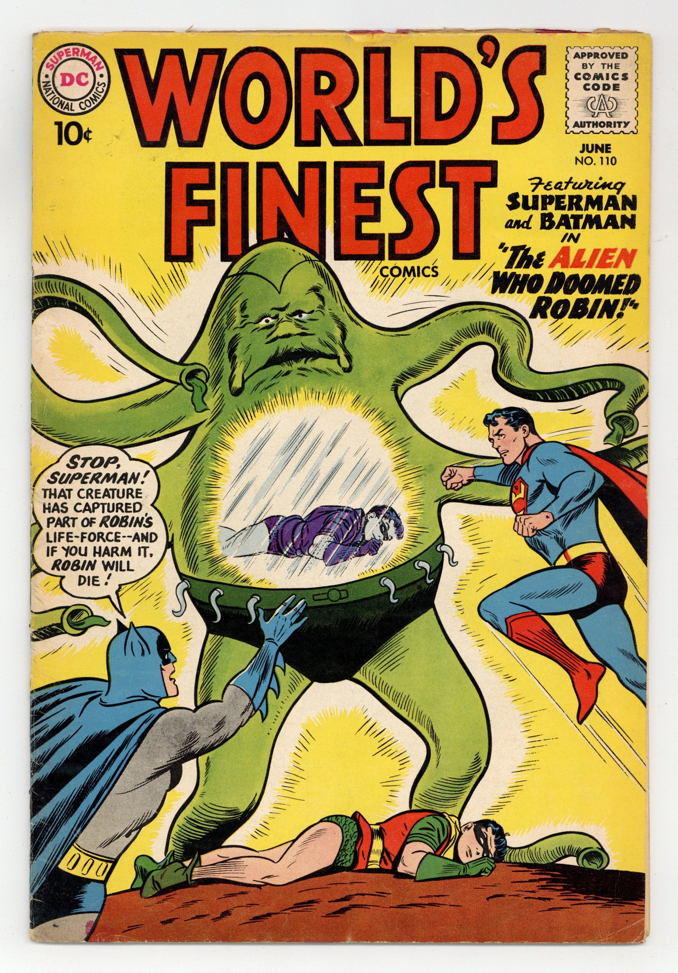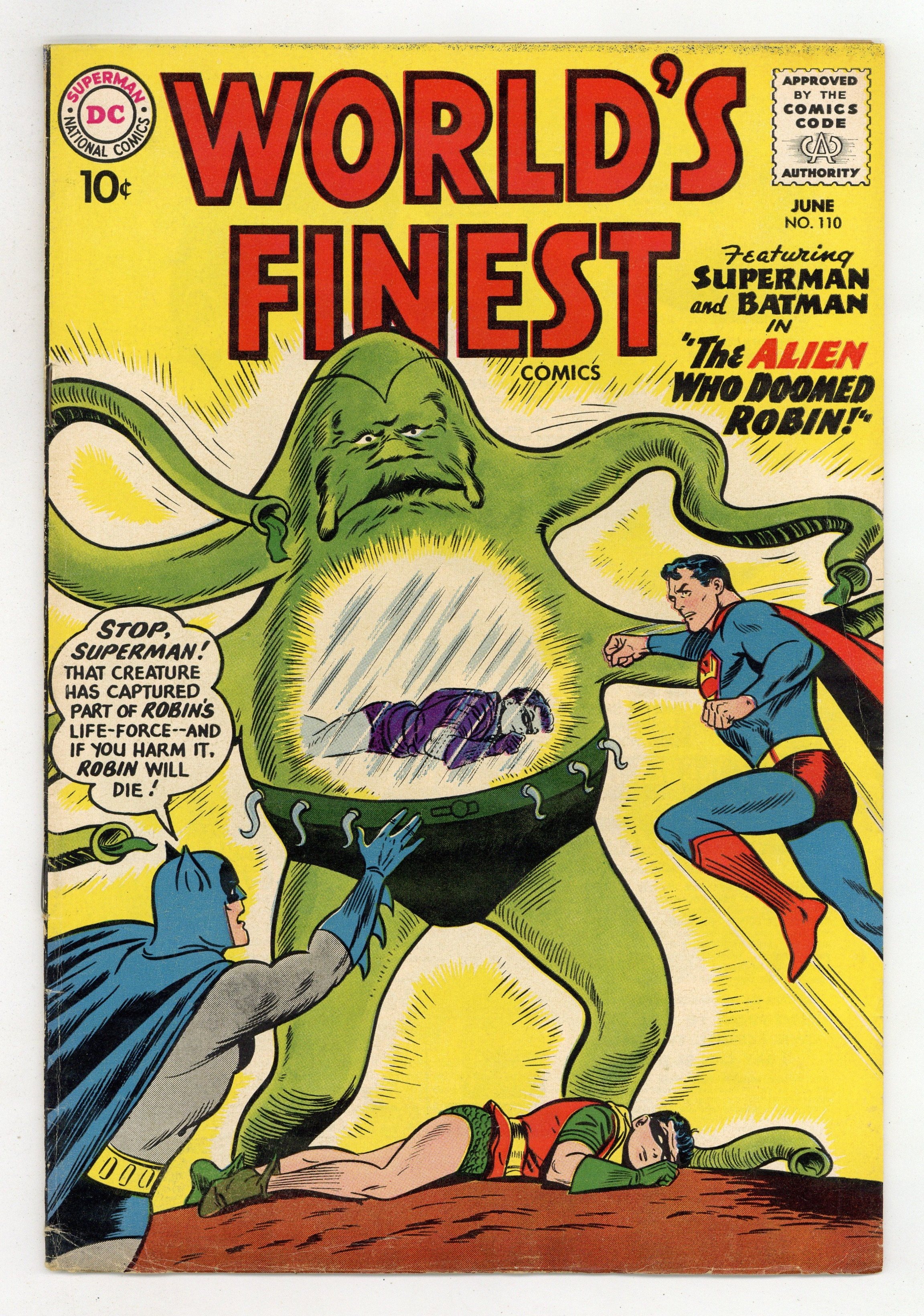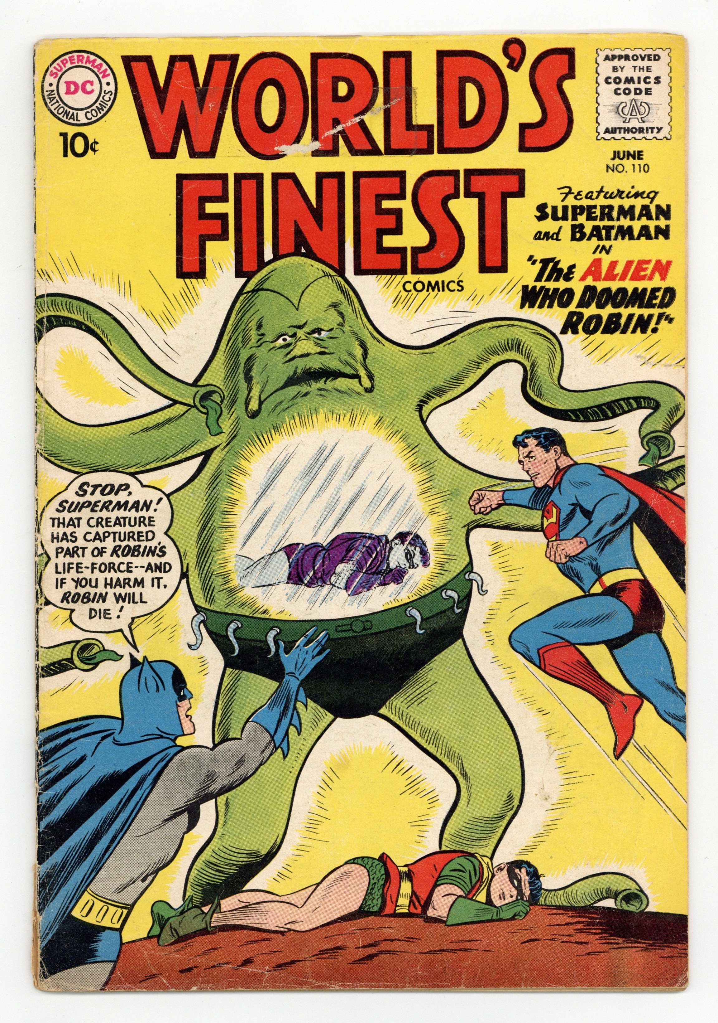 Cover pencils by Curt Swan, inks by Sheldon Moldoff. The Alien Who Doomed Robin starring Superman and Batman, script by Jerry Coleman, pencils by Dick Sprang, inks by Sheldon Moldoff; An alien arrives on Earth and starts shrinking buildings and stealing them; He plans to enlarge them on his homeworld and create a tourist attraction in space; Superman, Batman and Robin must stop him and return the shrunken buildings to their proper locations. Ollie humor page by Henry Boltinoff. The Robot Raiders starring Tommy Tomorrow, art by Jim Mooney. The Sinister Spectrum Man starring Green Arrow, script by Ed Herron, art by Lee Elias; Green Arrow and Speedy must find a way to stop the Spectrum Man and his gang of thieves. 36 Pages, Full Color. Cover price $0.10.
