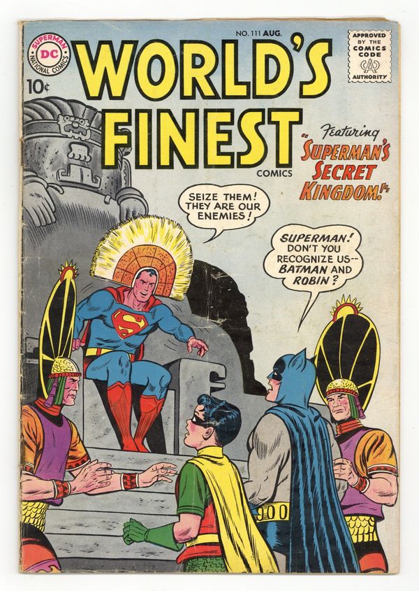 Starts Dec 8 Cover pencils by Curt Swan, inks by Sheldon Moldoff. Superman's Secret Kingdom starring Superman and Batman, script by Bill Finger, pencils by Dick Sprang, inks by Sheldon Moldoff; The force of a volcanic eruption gives Superman amnesia. He finds himself in a forgotten Aztec city and becomes the king of the inhabitants; When Batman and Robin go in search of him, they find the criminal Floyd Frisby who tries to convince Superman that Batman and Robin are really criminals. Ollie humor page by Henry Boltinoff. The Hermit of Titan starring Tommy Tomorrow, script by Jack Miller, art by Jim Mooney. Lend A Friendly Hand public service announcement starring Superman, script by Jack Schiff, pencils by Curt Swan, inks by Sheldon Moldoff. The Crimes of the Clock King starring Green Arrow, script by Ed Herron, art by Lee Elias; The Clock King is successful in a series of crimes, besting Green Arrow and Speedy. 36 Pages, Full Color. Cover price $0.10.