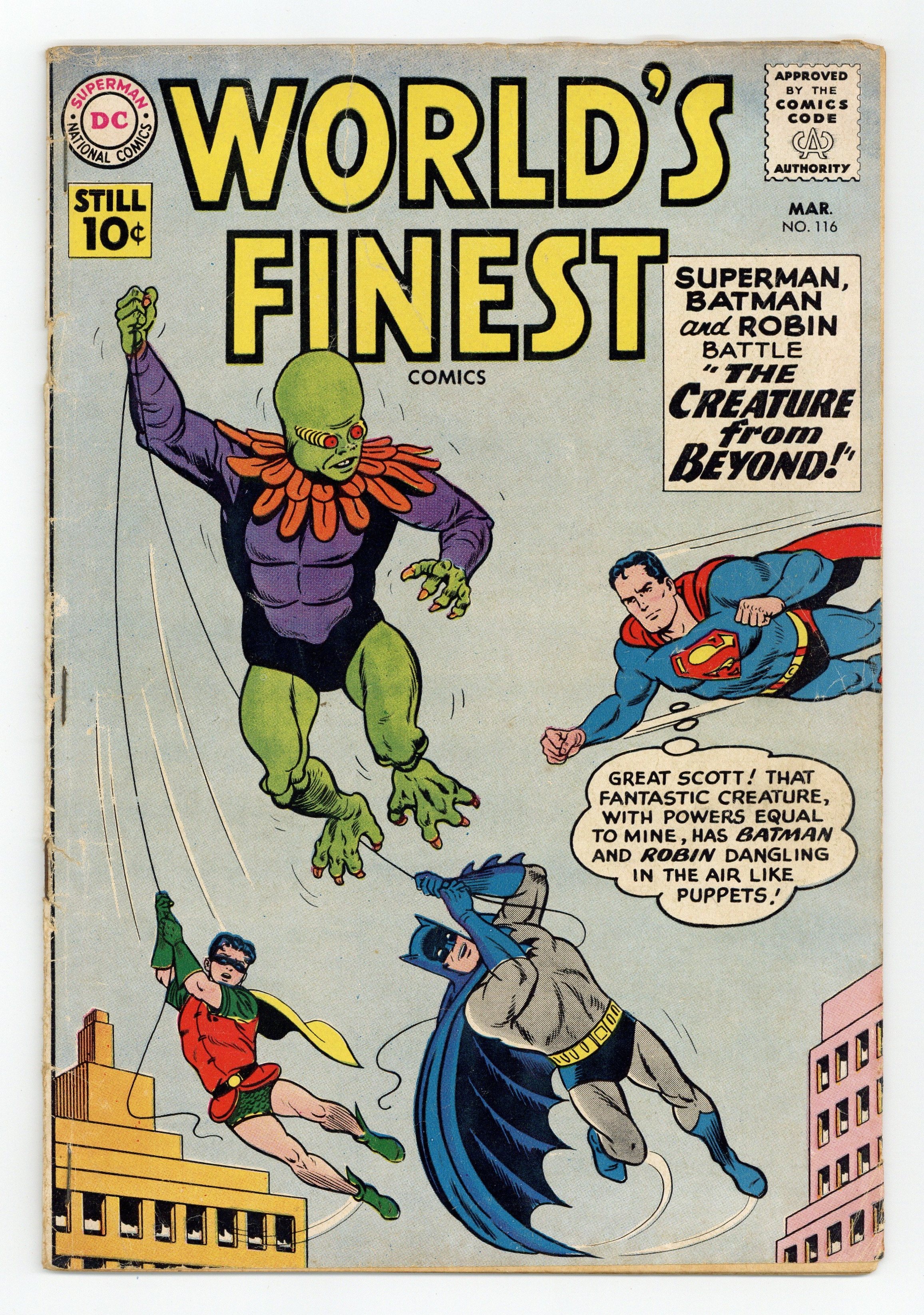 Cover pencils by Curt Swan. The Creature From Beyond! starring Superman and Batman, script by Jerry Coleman, pencils by Curt Swan, inks by Stan Kaye; The Creature from Beyond is helping the Jackson Mob commit robberies. Don' t Sell Nature Short public service announcement, script by Jack Schiff, art by Bernard Baily. Dateline: Outer Space starring Tommy Tomorrow, script by Jack Miller, art by Jim Mooney. Lem n' Lime humor page by Henry Boltinoff. The Ape Archer, script by Ed Herron, art by Lee Elias; Green Arrow and Speedy must determine what has mad the chimp Bonzo take up a life of crime. 36 Pages, Full Color. Cover price $0.10.