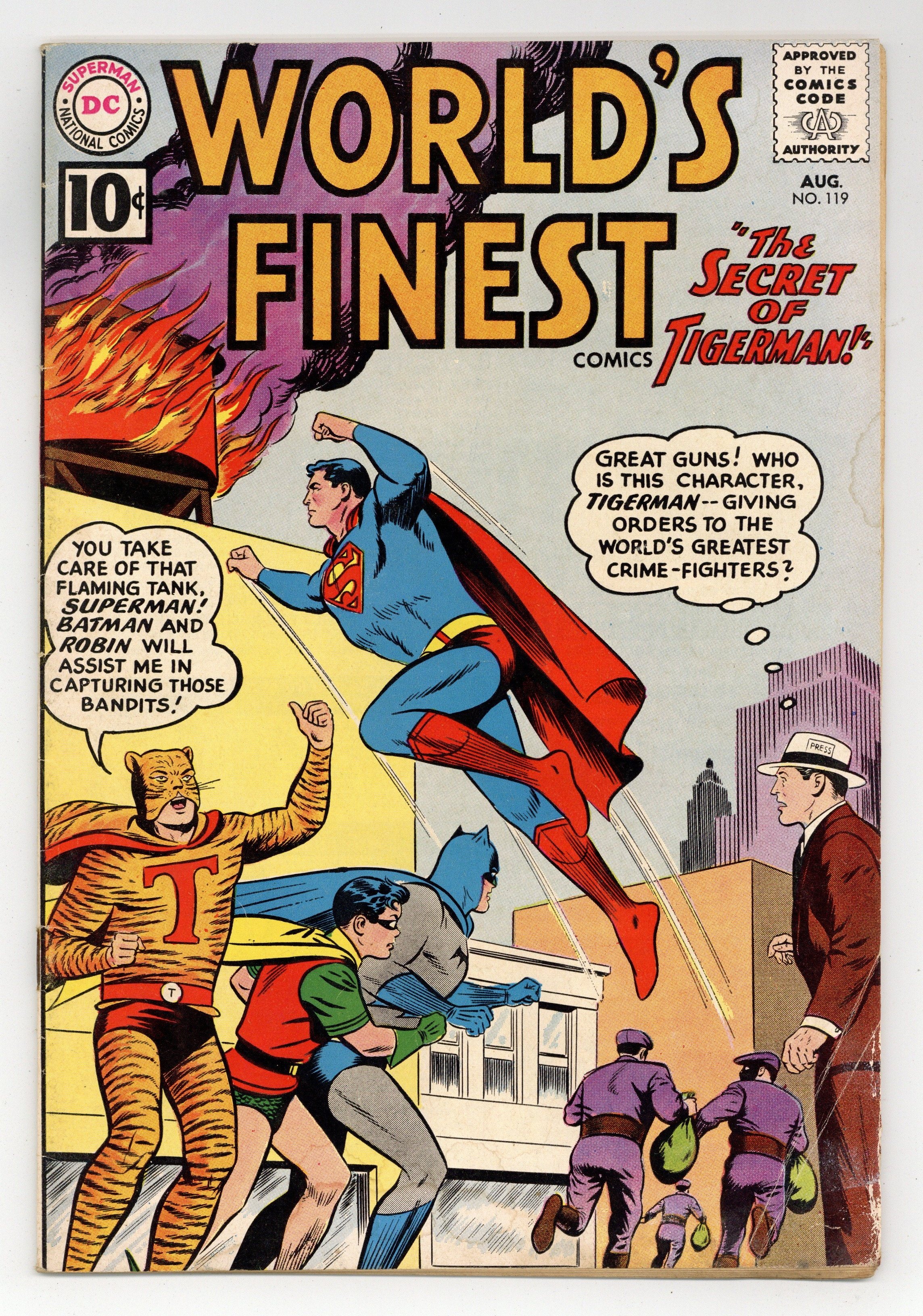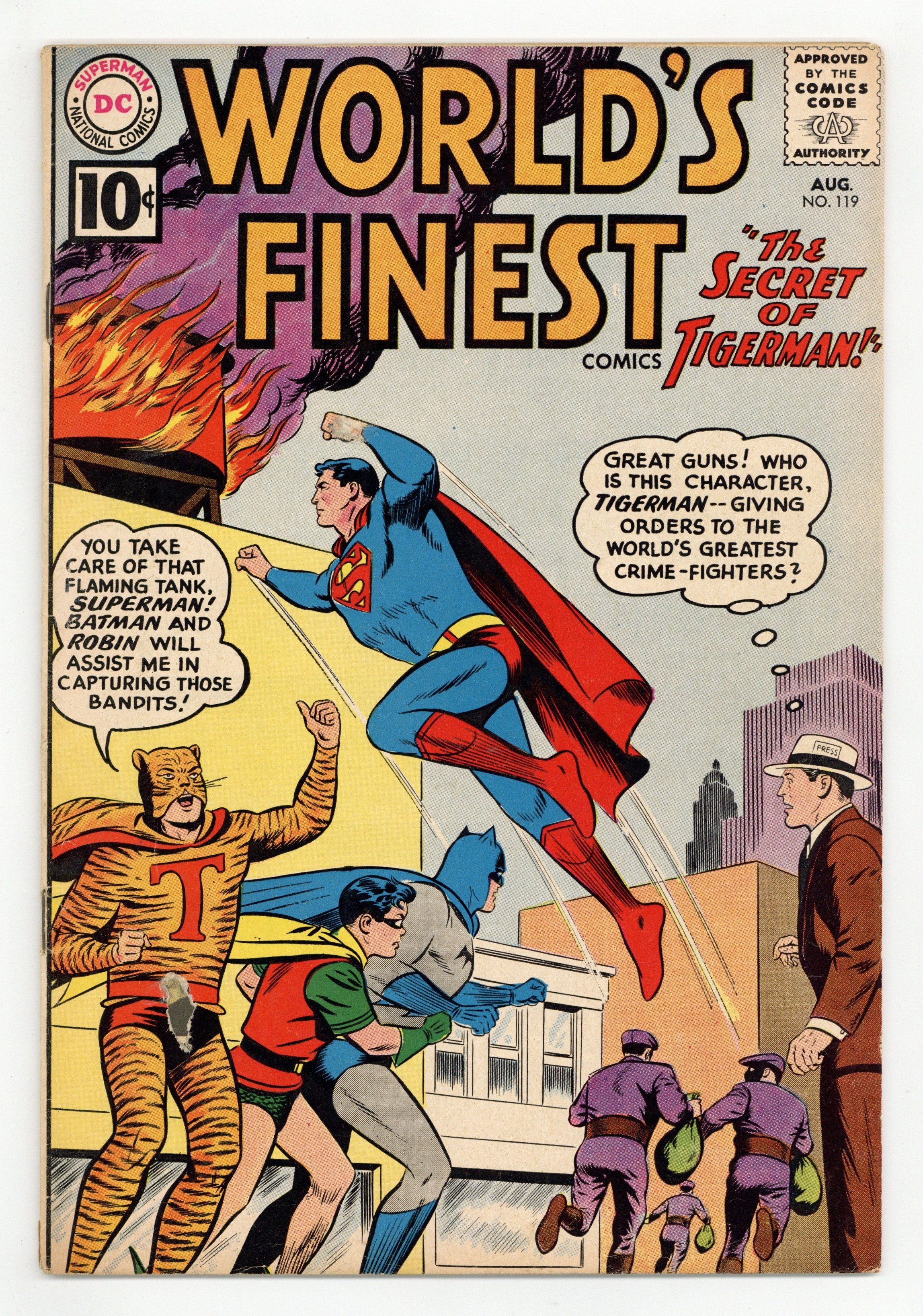 Cover pencils by Curt Swan, inks by Stan Kaye. The Secret of Tigerman starring Superman and Batman, script by Jerry Coleman, pencils by Dick Sprang, inks by Stan Kaye; Superman, Batman and Robin are suddenly following orders from a new superhero named Tigerman. The Earth King of Planetoid Plexis starring Tommy Tomorrow, script by Jack Miller, art by Jim Mooney. Storm Over The Sahara text story. The Man With The Magic Bow starring Green Arrow, art by Lee Elias; The Acrobat takes the "Magic Bow of Diana" from a museum heist, which allows him to fire arrows that magically follow his orders. 36 Pages, Full Color. Cover price $0.10.