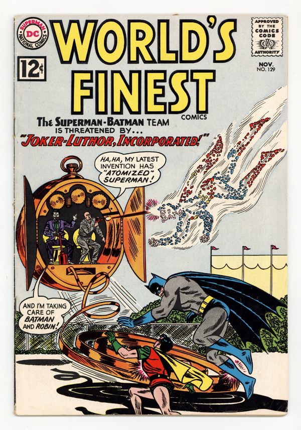 Ends Jan 26 10:10 PM CST Bid History 4 bids Current Bid $9 Your Secret Max Bid If you'd like to bid, please log in or register. Cover pencils by Dick Dillin, inks by Sheldon Moldoff. Joker-Luthor, Incorporated! starring Superman and Batman, script by Dave Wood, pencils by Jim Mooney, inks by Sheldon Moldoff; Joker and Luthor team up to rob a large gem show. Health Myths Debunked! public service announcement, script by Jack Schiff, art by Sheldon Moldoff. The Menace Of The Alien Fish starring Aquaman and Aqualad, art by Ramona Fradon; Aquaman and Aqualad help an alien who has crashed on Earth to round up three alien fish he brought with him. Menace of the Meteorites text story. The Iron Archer! starring Green Arrow, pencils by Lee Elias, inks by Lee Elias; Green Arrow and Speedy must stop a group of bank robbers with a robot that shoots arrows. 36 Pages, Full Color. Cover price $0.12.
