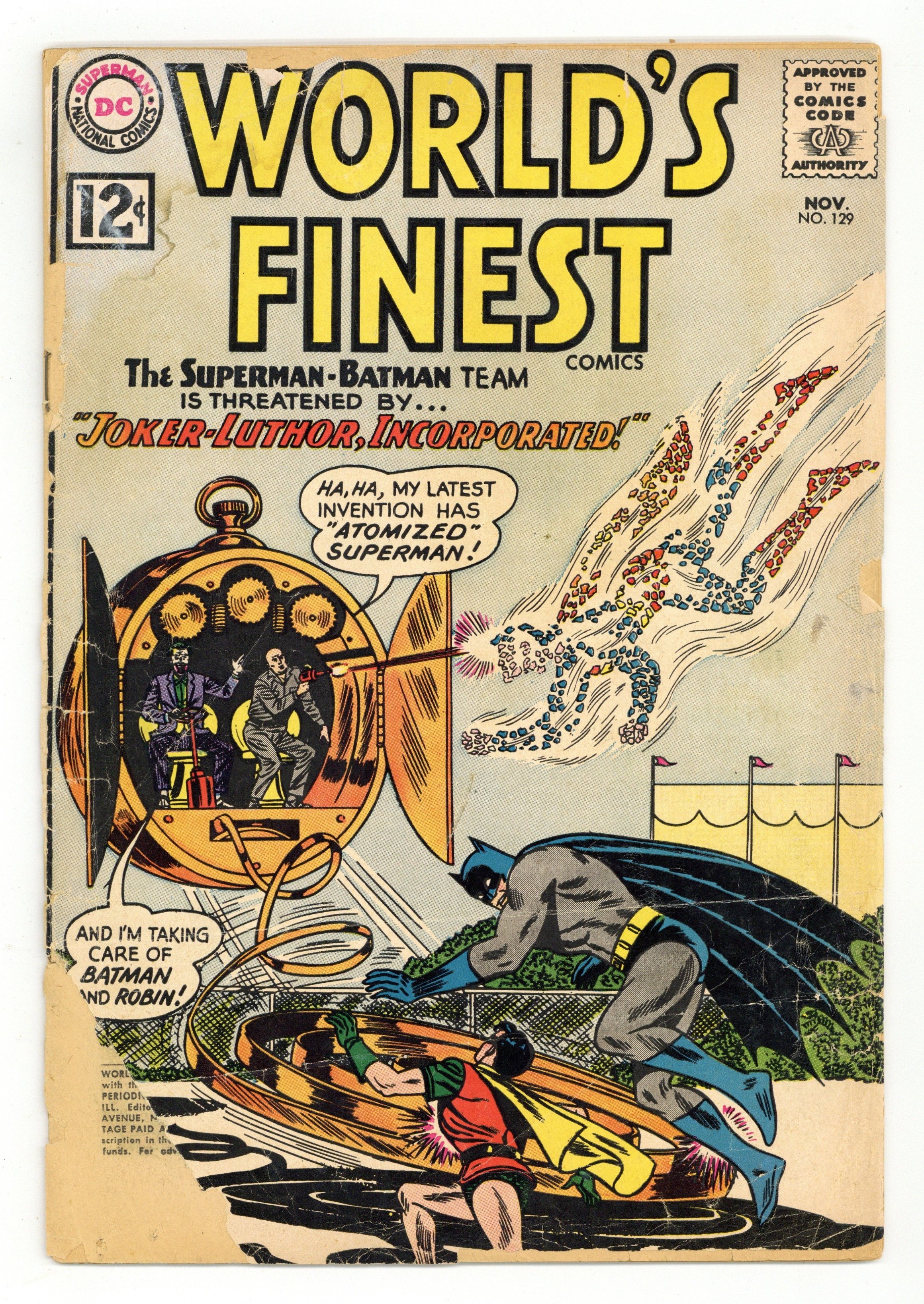 Cover pencils by Dick Dillin, inks by Sheldon Moldoff. Joker-Luthor, Incorporated! starring Superman and Batman, script by Dave Wood, pencils by Jim Mooney, inks by Sheldon Moldoff; Joker and Luthor team up to rob a large gem show. Health Myths Debunked! public service announcement, script by Jack Schiff, art by Sheldon Moldoff. The Menace Of The Alien Fish starring Aquaman and Aqualad, art by Ramona Fradon; Aquaman and Aqualad help an alien who has crashed on Earth to round up three alien fish he brought with him. Menace of the Meteorites text story. The Iron Archer! starring Green Arrow, pencils by Lee Elias, inks by Lee Elias; Green Arrow and Speedy must stop a group of bank robbers with a robot that shoots arrows. 36 Pages, Full Color. Cover price $0.12.