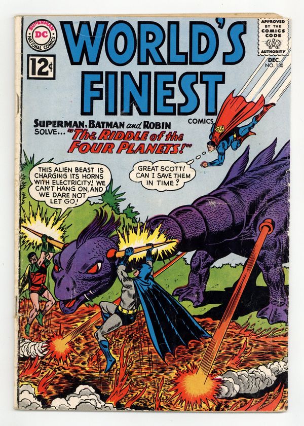 Starts Feb 2 Cover pencils by Dick Dillin, inks by Sheldon Moldoff. Riddle of the Four Planets! starring Superman and Batman, script by Jerry Coleman, art by Jim Mooney; Superman, Batman and Robin must help an alien race stop the Zelaphod, an alien beast that is loose on Earth. King of the Land Beasts, art by Ramona Fradon; Strange chemicals cause Aquaman to turn green and lose his ability to live underwater. War Against the Weather filler page. The Human Sharks, art by Lee Elias; Green Arrow and Speedy must stop a gang of thieves who operate underwater. Superman stars in a one-page public service announcement, "Pennies for UNICEF!" 36 Pages, Full Color. Cover price $0.12.