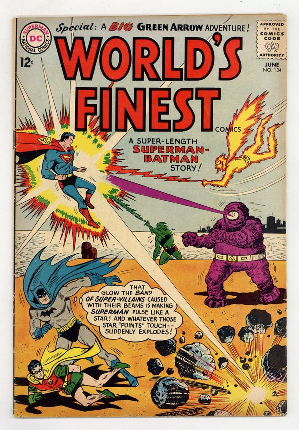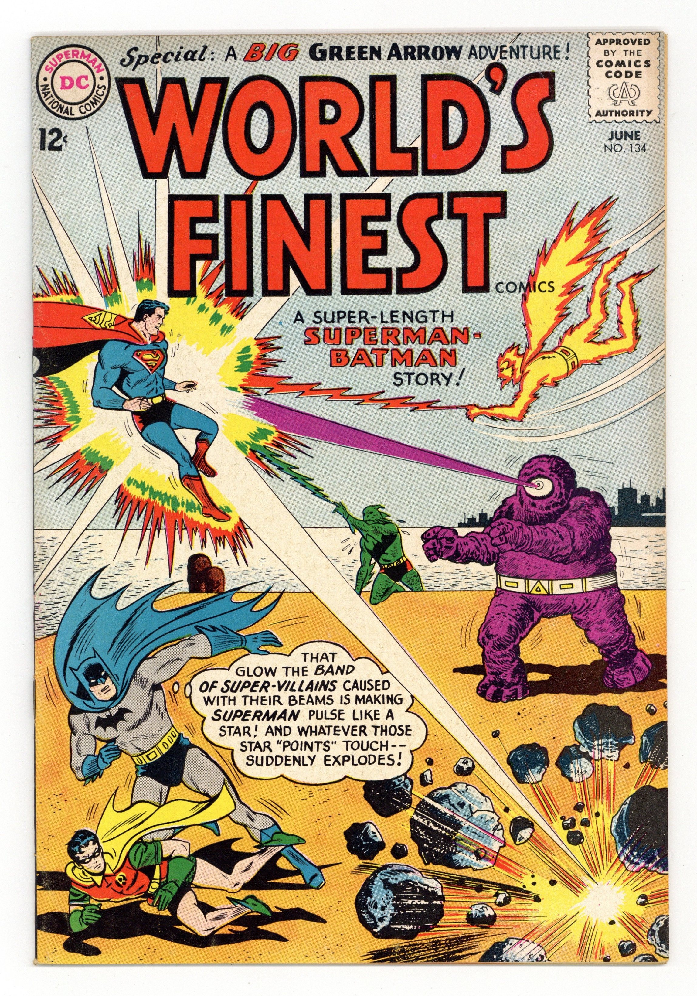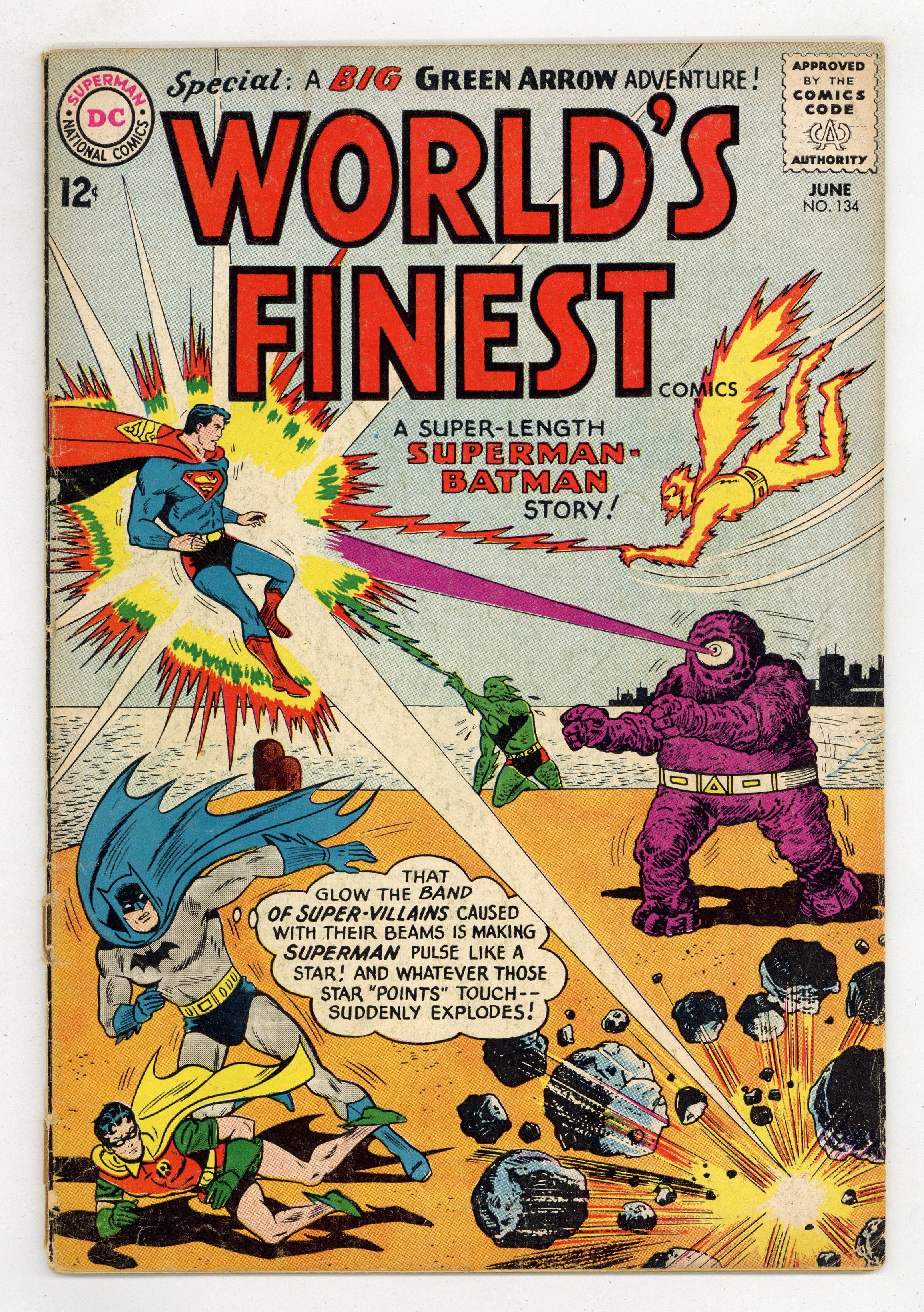 Tags: Superman$17.75Cover pencils by Dick Dillin, inks by Sheldon Moldoff. Not Wanted: High School Dropouts public service announcement, script by Jack Schiff, art by Sheldon Moldoff. The Band of Super-Villains starring Superman and Batman, script by Bill Finger, art by Jim Mooney; An alien gives three criminals belts that give them super powers. These belts, unkown to the users, change the atmostphere of Earth to something suiting the alien. The Mystery Of The Missing Inventors!, script by Ed Herron, art by Lee Elias; Green Arrow, Speedy and Miss Arrowette must stop a gang from stealing an anti-gravity machine and the destructive Z-Ray. 36 Pages, Full Color. Cover price $0.12.