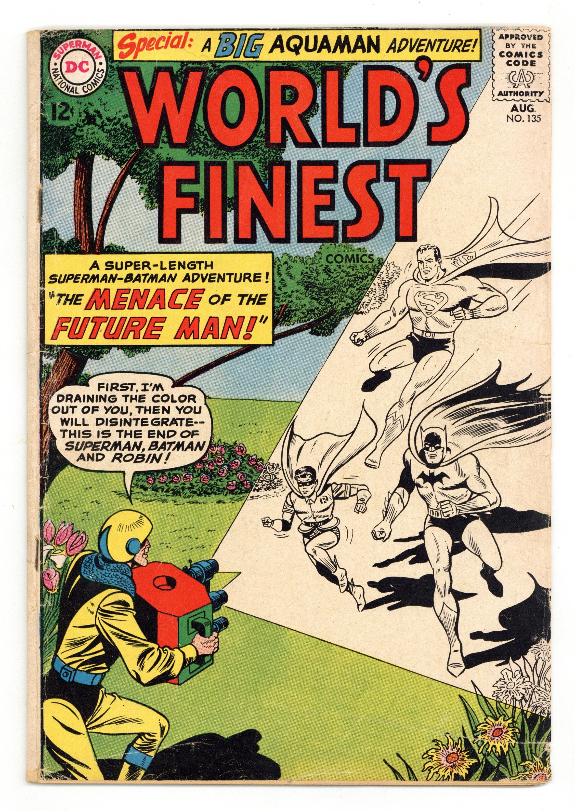Tags: Superman$16.00Cover pencils by Dick Dillin, inks by Sheldon Moldoff. Menace of the Future Man starring Superman and Batman, script by Bill Finger, pencils by Dick Sprang, inks by Sheldon Moldoff; Superman and Batman chase the mysterious time-traveling Future Man into the future and the past. The Future Man combines kryptonite with Thor's hammer to create a future weapon. How NOT to Enjoy a Vacation! public service announcement, script by Jack Schiff, art by Ruben Moreira. The Creatures That Conquered Aquaman, script by Jack Miller, art by Ramona Fradon; An alien scientist is forced to do the bidding of criminals. 36 Pages, Full Color. Cover price $0.12.