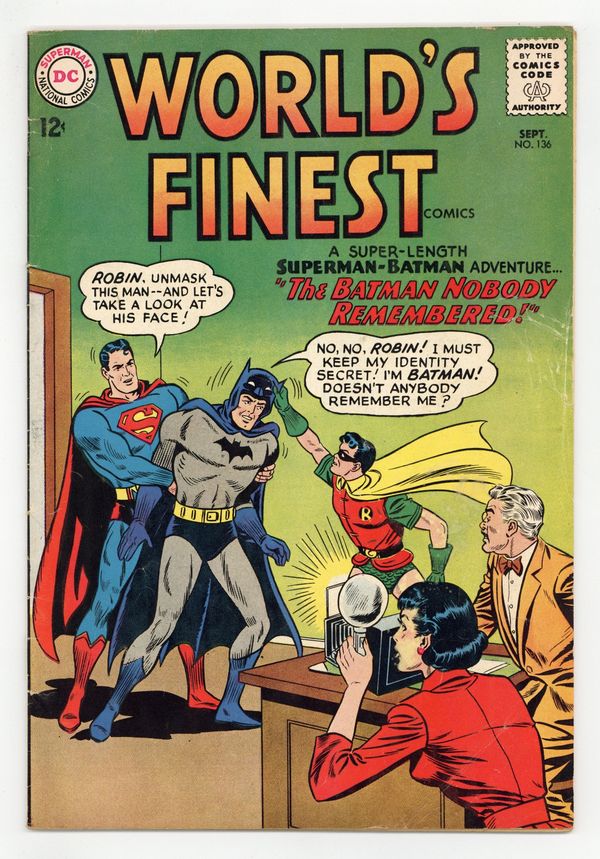 Cover pencils by Dick Dillin, art by Jim Mooney. The Batman Nobody Remembered starring Superman and Batman, script by Bill Finger, pencils by Jim Mooney, inks by Sheldon Moldoff; Batman accidentally ends up on a parallel world where Superman and Robin are a team and Batman doesn't exist. The Magician Boss Of The Incas, script by Ed Herron, art by Lee Elias; Green Arrow and Speedy chase a magician-crook through the wilds of Peru. 36 Pages, Full Color. Cover price $0.12.