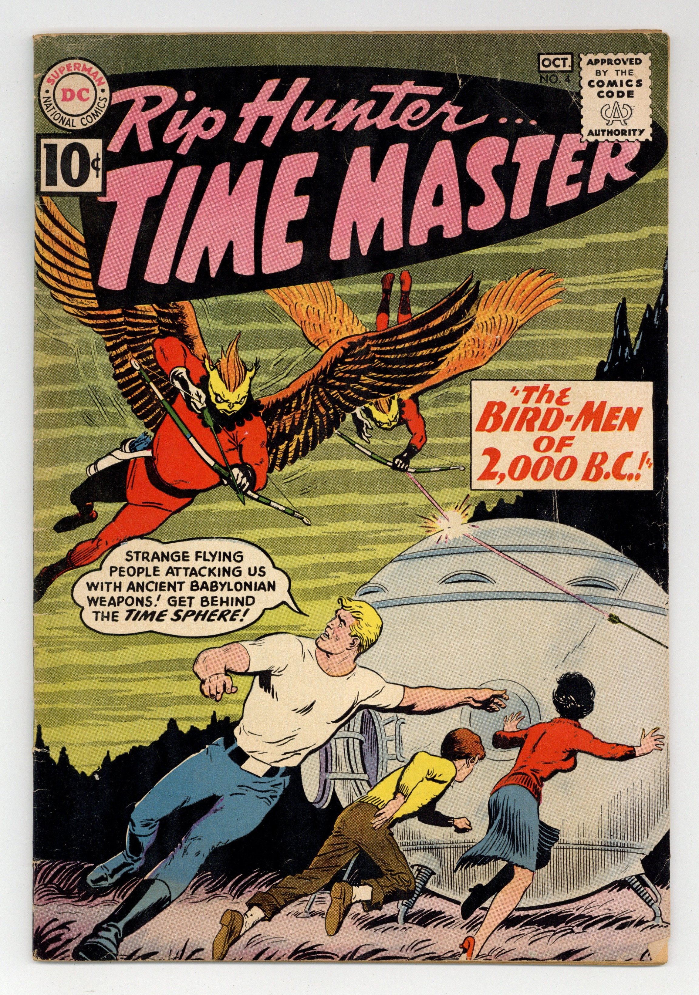 Written by Jack Miller. Art and Cover by Nick Cardy. Strange flying people attack Rip, Bonnie and Corky with ancient Babylonian weapons! Can they make it to the Time Sphere? Don't miss Rip Hunter in the 3-part tale by Jack Miller and Nick Cardy: "The Bird-Men of 2,000 B.C."; "Chapter 2: The Ancient Air Raid"; and "Chapter 3: The Avenging God of Gilgamesh"! Plus: 1-page text story "The Thief of Time"! 32 pages, full color. Cover price $0.10.