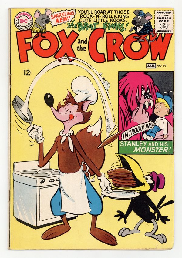 1st Appearance of Stanley & His Monster. Cover art by Mort Drucker. When Is a Dog Not a Dog? starring Stanley and His Monster, script by Arnold Drake, art by Win Mortimer; Stanley Dover's parents worry about his overactive imagination, but they won't let him have a dog. When he brings home a giant pink monster that he found in the sewer, no one notices. Untitled The Fox and the Crow story, script by Cecil Beard, art by James F. Davis; Crow has his own obituary published so that he can pretend to be a ghost and annoy Fox even more than usual. Untitled The Brat Finks story, script by Paul Laikin and Bill Finger, art by Bob Oksner; The brats go to the station to pick up Cousin Reggie but they bring back the wrong guy. 36 Pages, Full Color. Cover price $0.12.