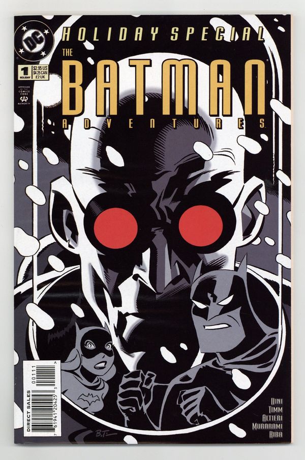 Starts Dec 15 Cover by Bruce Timm. Stories by Paul Dini with Bruce Timm and Ronnie Del Carmen. Art by Bruce Timm, Ronnie Del Carmen, Kevin Altieri & Butch Lukic, Dan Riba and Glen Murakami. December in Gotham City -- that's the theme of THE BATMAN ADVENTURES HOLIDAY SPECIAL, a 64-page one-shot special featuring five thrilling, funny or touching yuletide stories by a slew of creators from The Adventures of Batman & Robin, the hit cartoon from Warner Bros. Animation. Emmy award-winning writer/producer Paul Dini writes all five stories. Art for the lead feature "Jolly Ol' St. Nicholas," featuring Detective Harvey Bullock teaming with Batgirl in a tense battle against Clayface, is by director/producer Bruce Timm, Dini's collaborator on the Eisner and Harvey Award-winning THE BATMAN ADVENTURES: MAD LOVE. Also in the Special, artist Ronnie Del Carmen illustrates "The Harley and the Ivy," a tale of Harley Quinn and Poison Ivy in which the duo kidnaps millionaire Bruce Wayne so they can go on an unlimited shopping spree. A madcap New Year's Eve with the Joker is the subject of "What Are You Doing New Year's Eve?", the story pencilled by director Kevin Altieri, while elsewhere, Batman and Commissioner Gordon take time out to share some New Year's cheer in "Should Old Acquaintance Be Forgot," with art by director Dan Riba. And the icing of Gotham City is just the beginning of the poignant Mr. Freeze story "White Christmas," illustrated by artist Glen Murakami. 64 pages, full color. Cover price $2.95.
