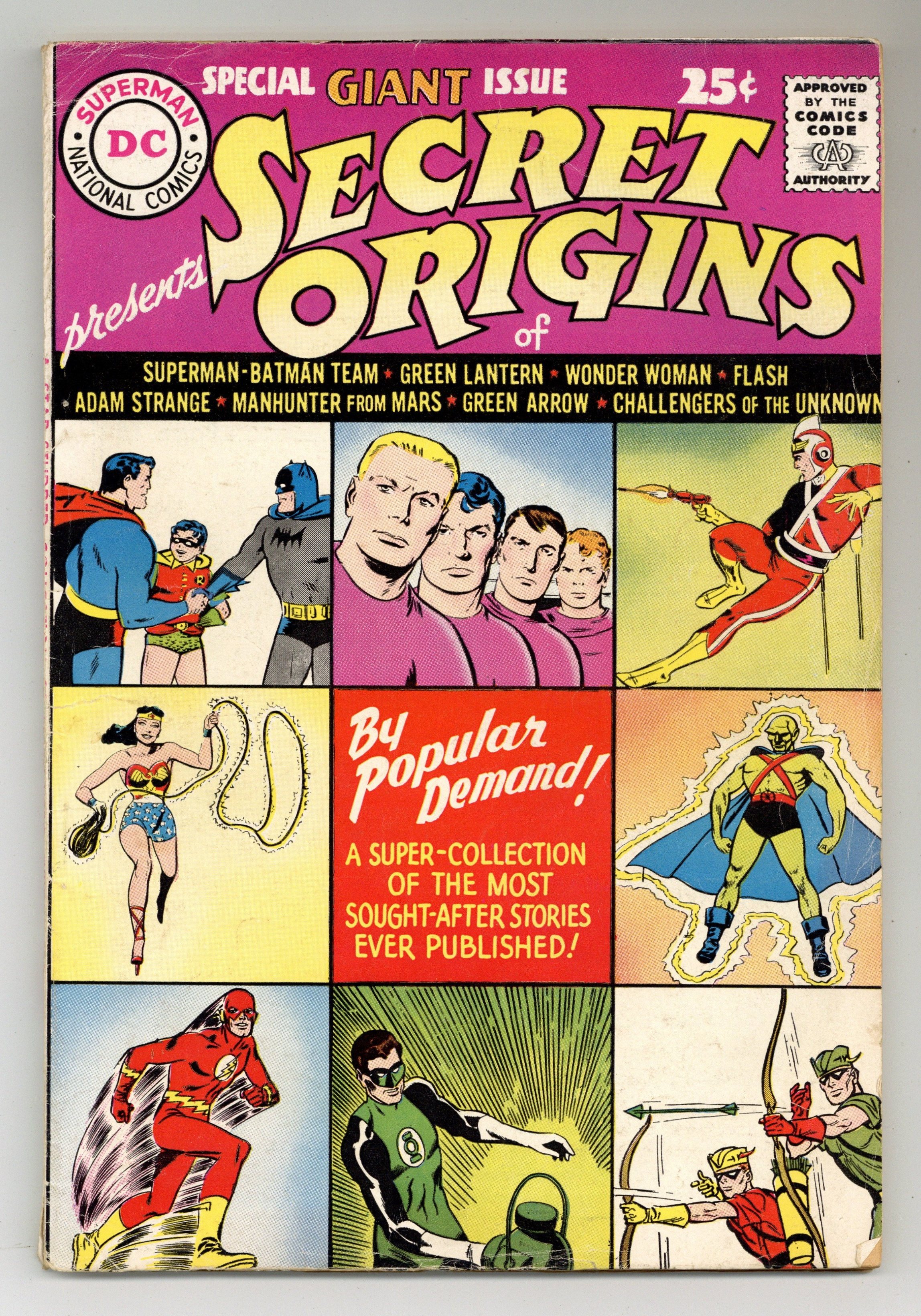 Reprints: Adam Strange (from Showcase 17), Green Lantern (G.L. 1), Challengers of the Unknown (Showcase 6), J'onn J'onzz (Detective 225), Flash (Showcase 4), Green Arrow and Speedy (1 page text), Superman-Batman team (World's Finest 94), and Wonder Woman (W.W. 105). Pencils by Jack Kirby, Gil Kane, Carmine Infantino, and others. Cover price $0.25.