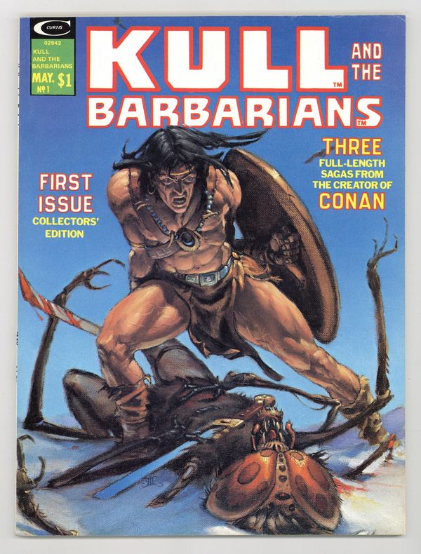2 pages new Neal Adams art (text illos): King Kull, Bran Mak Morn, Solomon Kane, and Red Sonja. The rest are reprints: "A King Comes Riding" from Kull the Conqueror 1 (script by Roy Thomas, pencils by Ross Andru, inks by Wally Wood; adapted from stories by Robert E. Howard), "The Shadow Kingdom" from Kull the Conqueror 2 (script by Thomas, pencils by Marie Severin, inks by John Severin), and "The Valley of the Worm" from Supernatural Thrillers 3 (pencils by Gil Kane, inks by Ernie Chan). New Michael Whelan cover painting. Cover price $1.00.