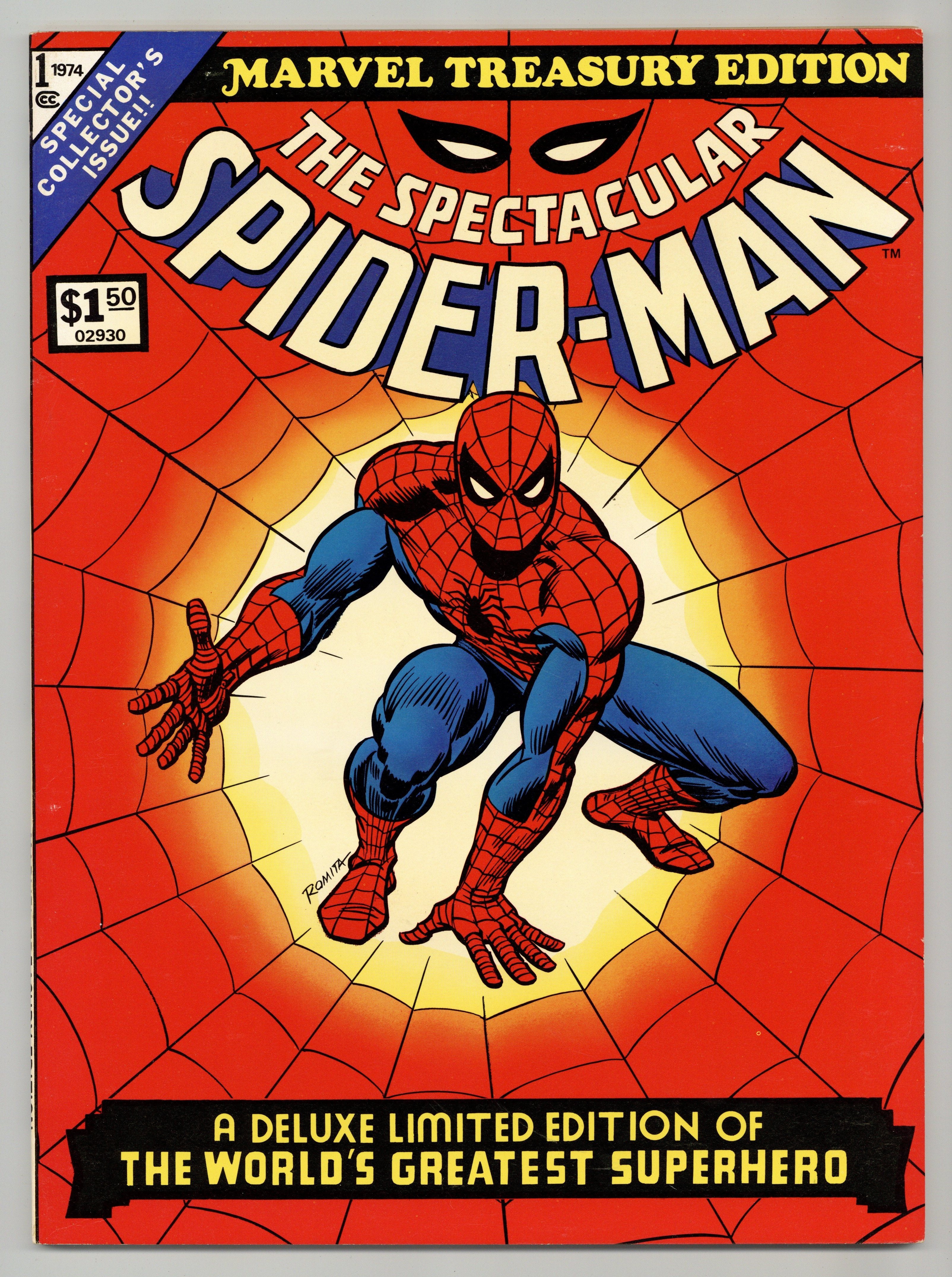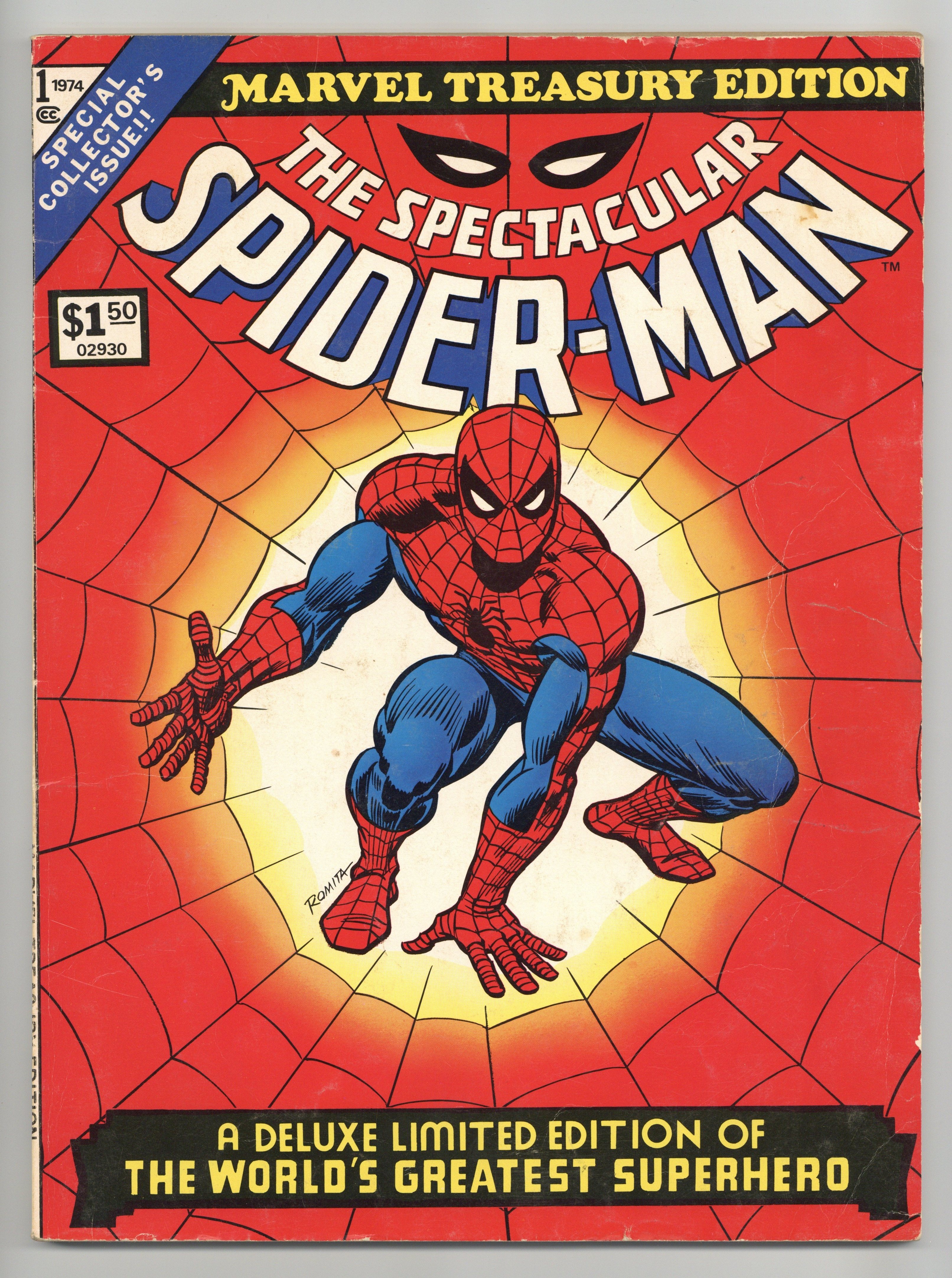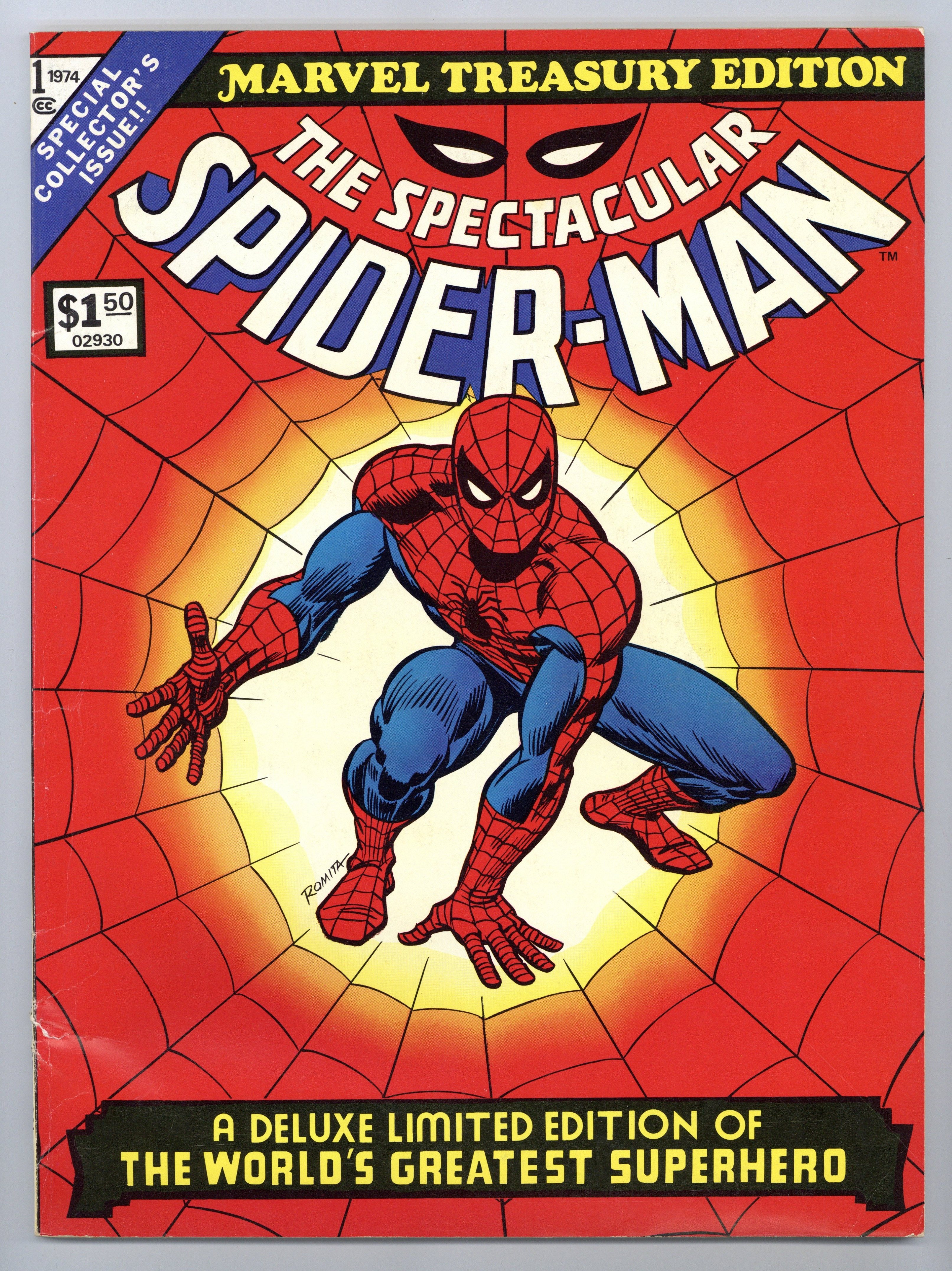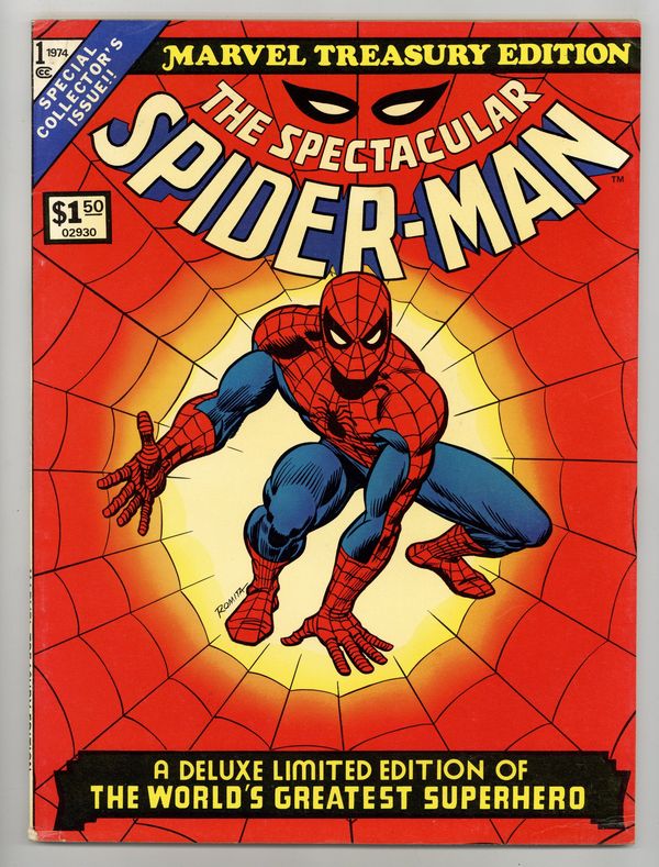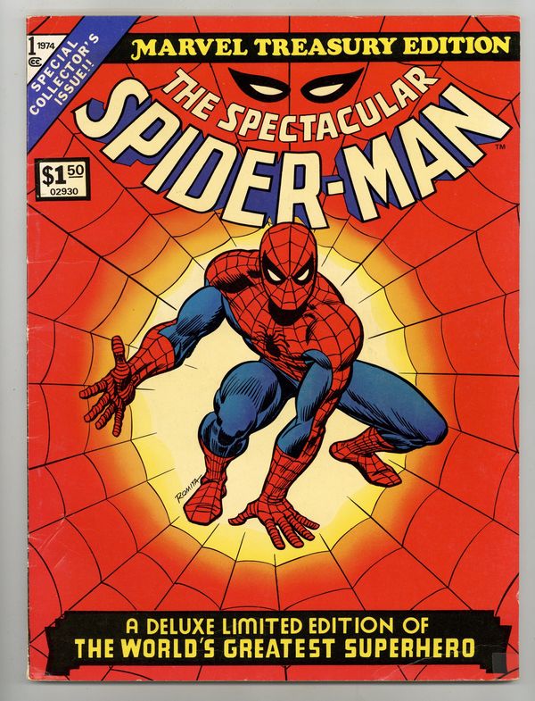 Marvel Treasury Edition (1974) #1 features the Spectacular Spider-Man. Special introduction by Stan Lee. This issue features "The Green Goblin" (Reprints 1st app. of GG) by Stan Lee and Steve Ditko, "Spider-Man Tackles the Torch" (Reprints Strange Tales Annual #2) by Stan Lee and Jack Kirby, "The Birth of a Super-Hero" (Reprints Amazing Spider-Man #42) by Stan Lee and John Romita, "The Reprehensible Riddle of The Sorcerer" (Reprints Marvel Super Heroes #14) Story by Stan Lee and Ross Andru, and finally "And Death Shall Come" (Reprints Amazing Spider-Man #90) by Stan Lee and Gil Kane. Features the villainy of the Green Goblin, the Enforcers, Rhino, and Dr. Octopus. Guest-starring the Incredible Hulk, Fantastic Four, and John Jameson. Also included is 2-page spread from the Daily Bugle and a pin-up featuring Spider-Man, Thor, Hulk, Thing, Hercules, and the Savage Sub-Mariner. 94 pages. Cover price $1.50.