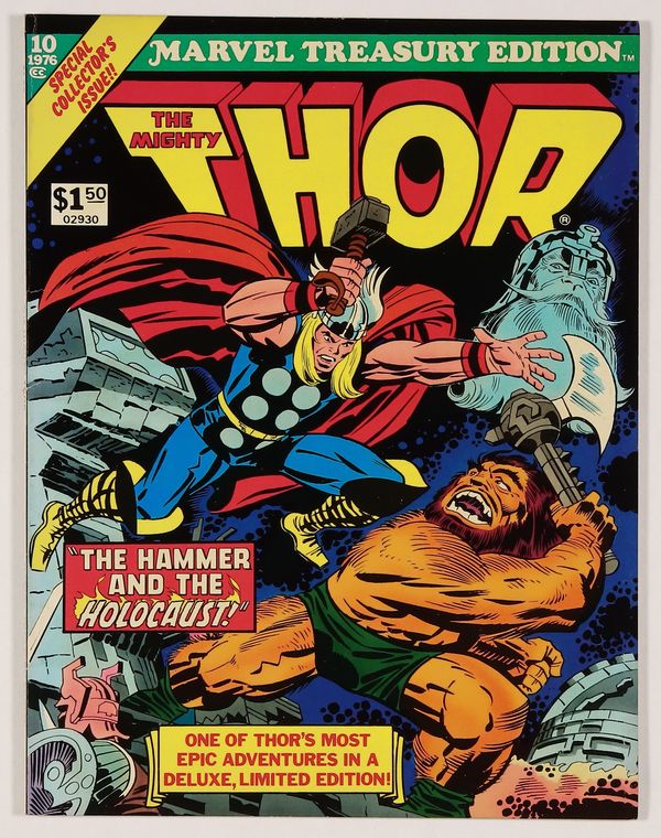 Marvel Treasury Edition (1974) #10 features the Mighty Thor. Story by Stan Lee. Art by Jack Kirby. This issue features the Odinson in one of his greatest and most epic adventures. He must battle the nigh unstoppable Mangog. Reprints Thor #154-157 featuring "To Wake the Mangog," "Now Ends the Universe," "The Hammer and the Holocaust," and "Behind Him Ragnarok." Appearances by Loki, Ulik, Warriors Three, Sif, Baldur, and Recorder. 82 pages. Cover price $0.50.