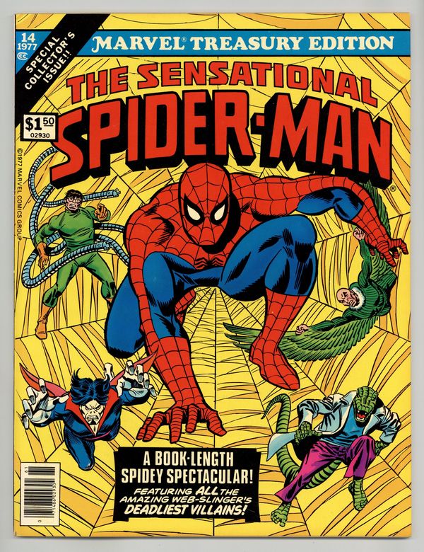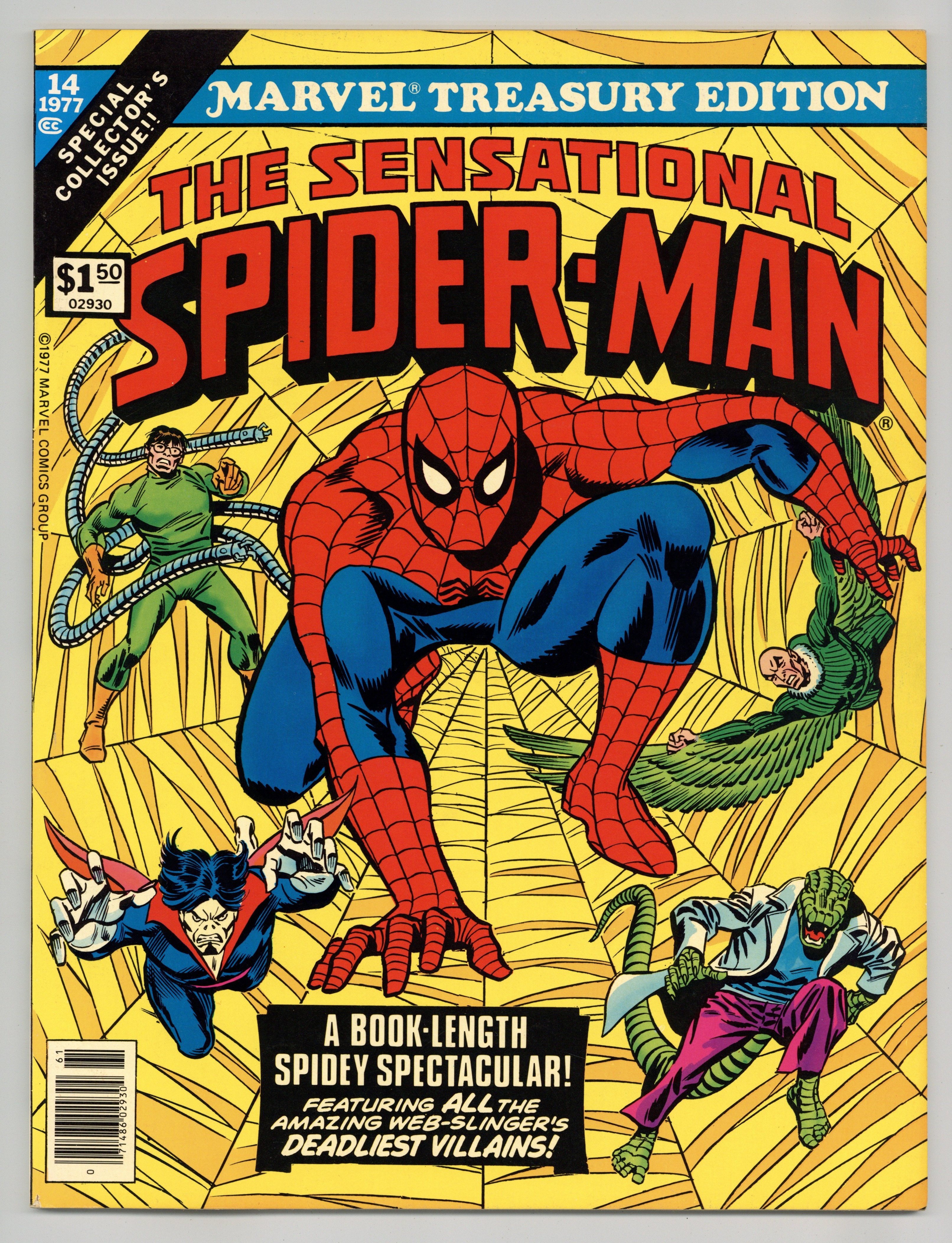 Marvel Treasury Edition (1974) #14 features the Sensational Spider-Man. This issue reprints Amazing Spider-Man #100-102 and features a five chapter Spidey epic that includes "The Spider or the Man?," "A Monster called Morbius," Vampire at Large," "The Way it Began," and "The Curse and the Cure!" Story by Stan Lee. Art by Gil Kane and Frank Giacoia. Featuring the villainy of Dr. Octopus, the Lizard, and Morbius the Living Vampire. Plus, a special reprint of Not Brand Ecch #6 by Gary Friedrich and Marie Severin. 82 pages. Cover price $1.50.