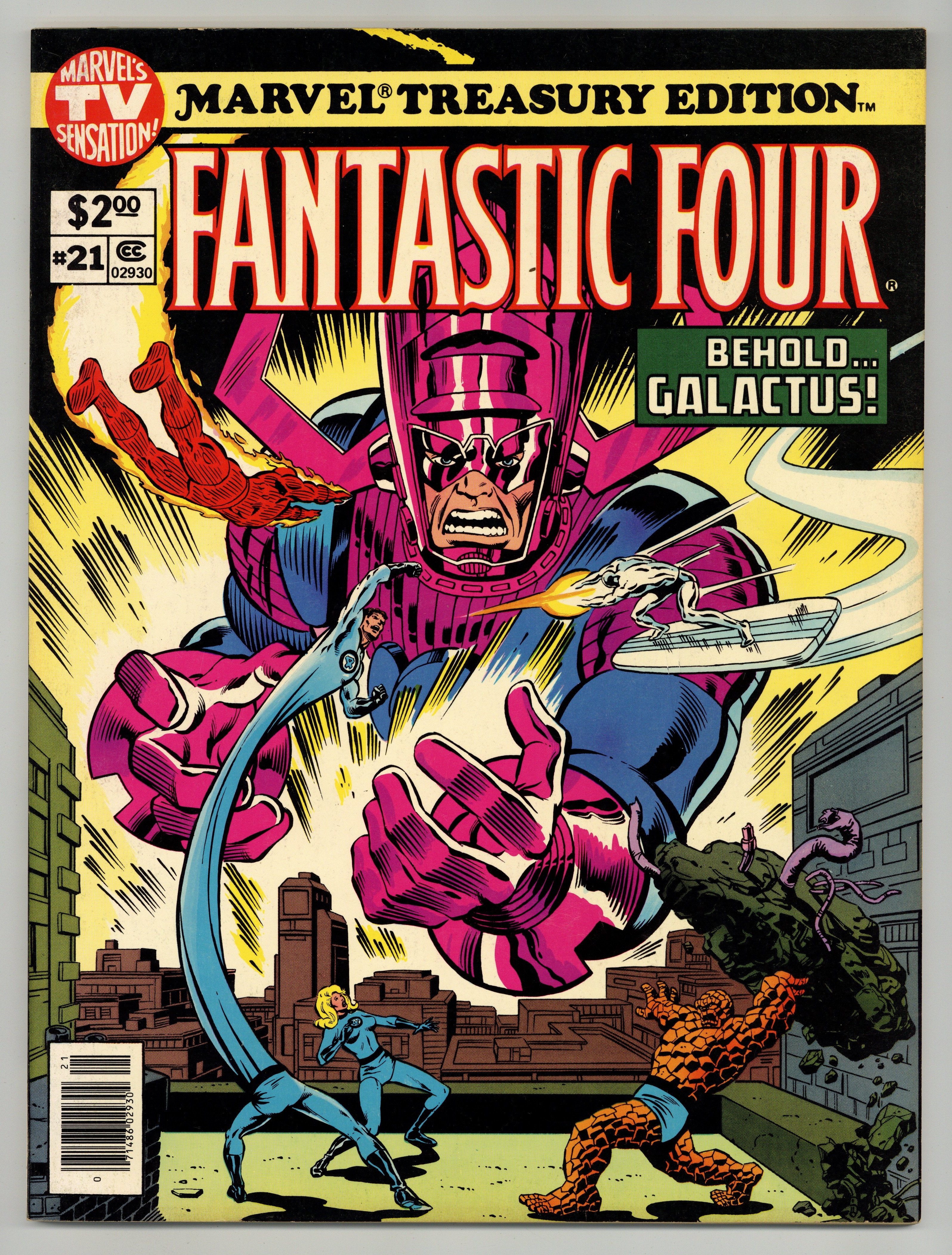 Marvel Treasury Edition (1974) #21 features the Fantastic Four. This issue includes one of the most epic FF tales as they must defend the planet against the World Devouring Galactus and his new herald Air-Walker. Reprints Fantastic Four #120-123. "The Horror that Walks on Air" by Stan Lee, John Buscema, and Joe Sinnott. Guest-starring the Silver Surfer. 80 pages. Cover price $2.00.
