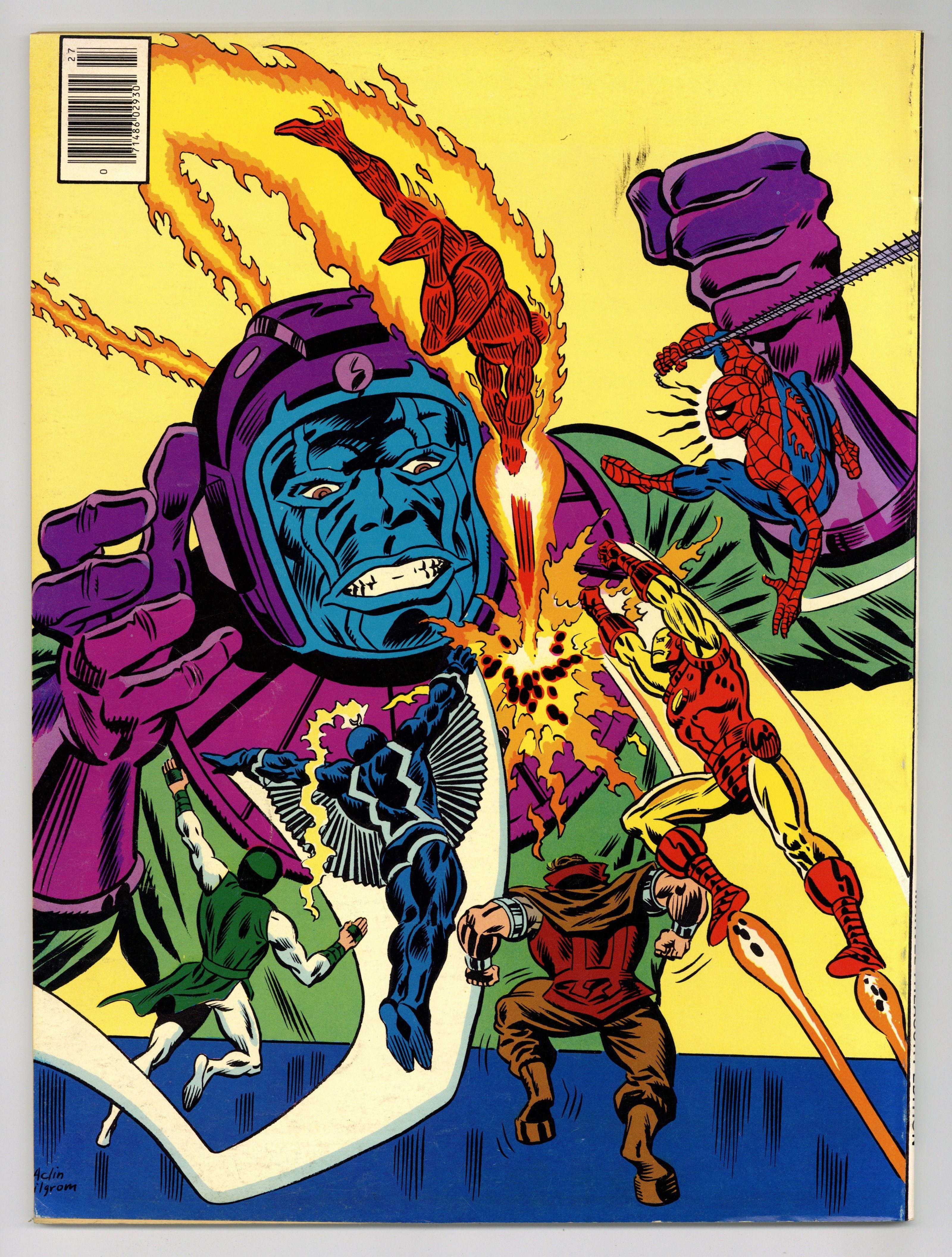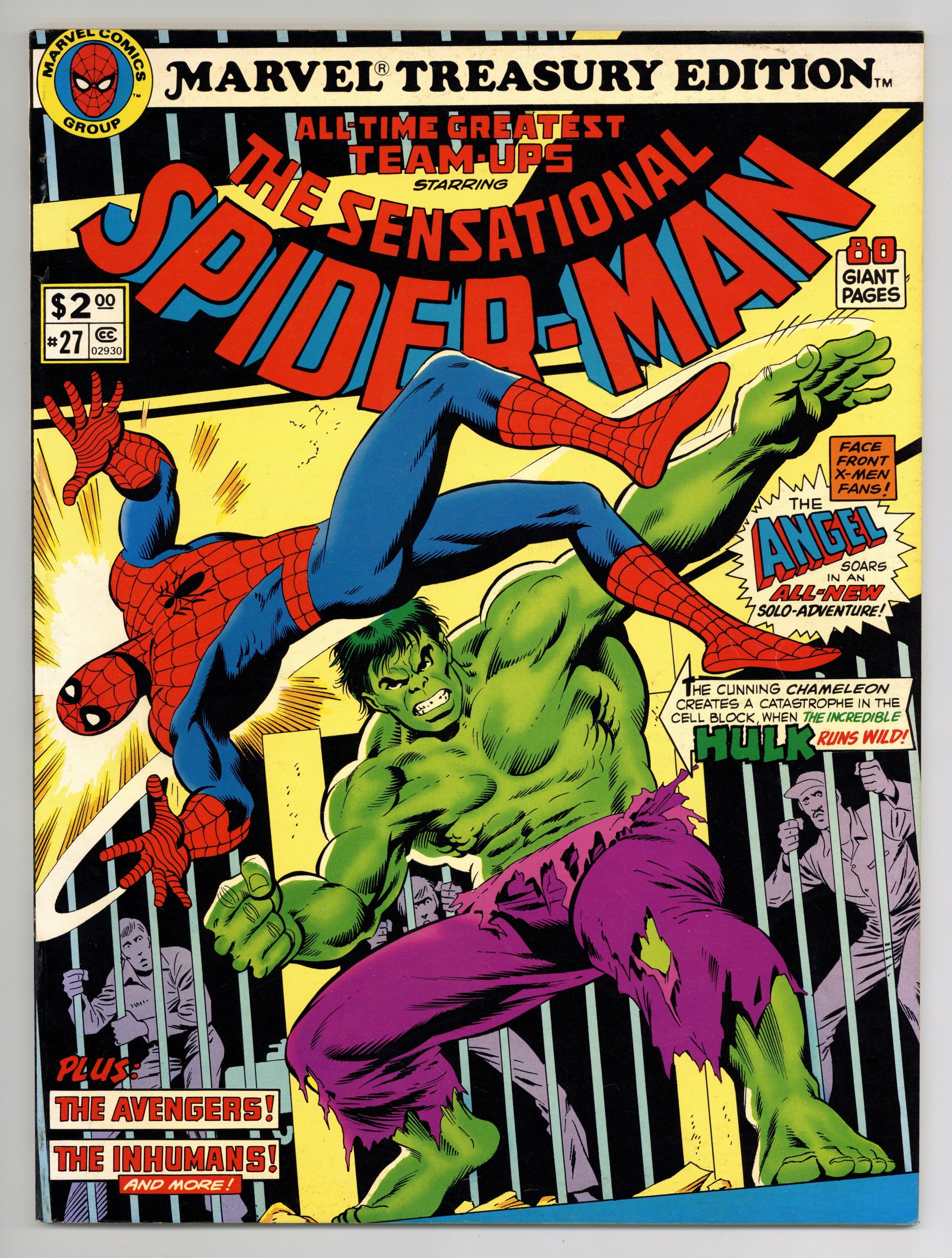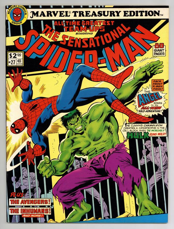 New 5-page Angel story, "Joyride into Jeopardy!" Script by Scott Edelman, pencils by Brent Anderson, inks by Bob McLeod. Reprints: "A Friend in Need!" (from Marvel Team-Up 27), "The Tomorrow War!" (from MTU 9; minus page 5), "Time Bomb!" (from MTU 10; minus page 1), and "The Doomsday Gambit!" (from MTU 11; minus pages 5-6). Featuring Spider-Man Spider-Man, the Hulk, the Inhumans, and the Avengers. New Mike Zeck/Jack Abel cover. Cover price $2.00.