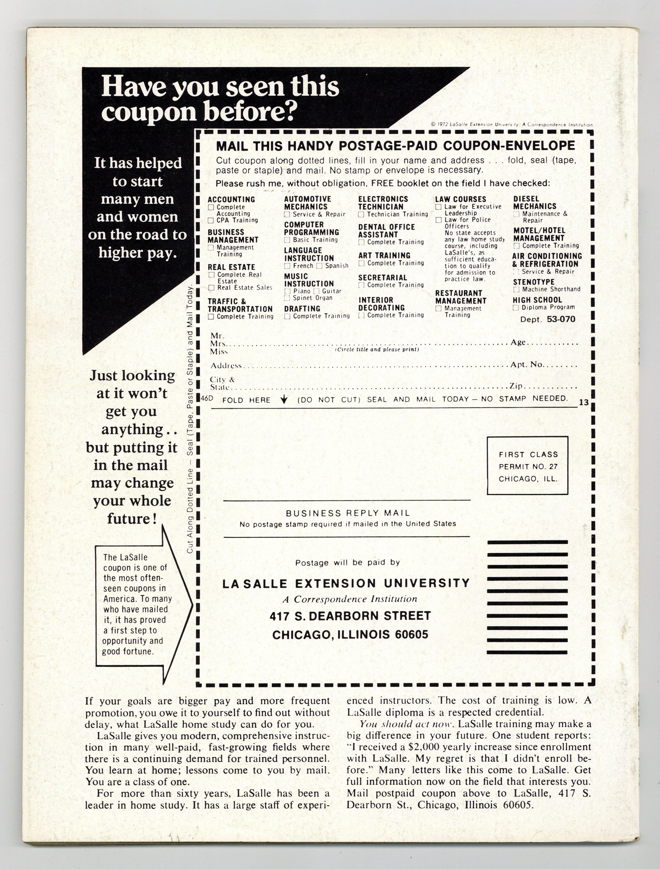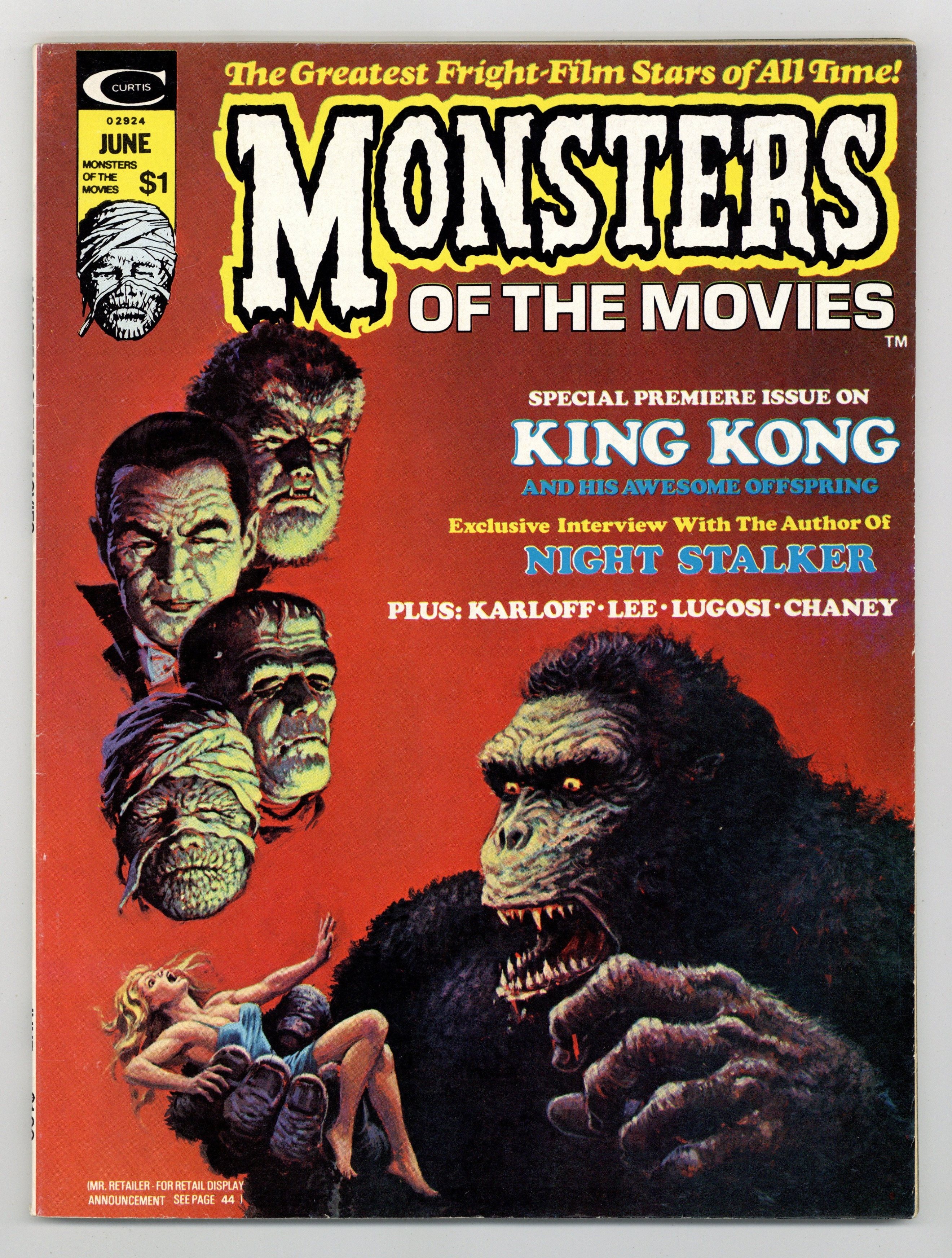 Stories and art by Stan Lee, Roy Thomas, Barry Windsor-Smith, Dan Adkins, Marv Wolfman, Don McGregor, Doug Moench, Chris Claremont and Tony Isabella. Marvel's attempt at a Famous Monsters-type magazine featured many Marvel legends early in their careers. Interviews with Frankenstein actor Boris Karloff and Jeff Rice, creator of Kolchak: The Night Stalker. Features about King Kong and horror on the radio. In an original comics story, horror-movie star Jason Roland makes a deal with a strange little man in exchange for fame. Movie stills from vintage horror movies with humorous word balloons added. Monsters of the Marvels; King Kong: Monarch of Monsters; The Night Stalker Papers; Horrorscoop; The Demon That Devoured Hollywood!; Out of the Mouths of Ghouls; Monsterscope; Karloff at the Raven's Castle; Monsters of the Radio. 8 1/2-in. x 11-in., 80 pages, B&W. Cover price $1.00.